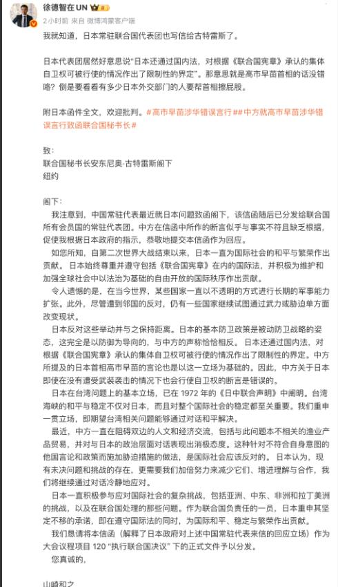 果不其然,在中方向联合国秘书长古特雷斯致函之后,日方也写了一份信,大概意思就是说中方“反应过度”了,说什么军事透明度,扯什么日本遵守了国际法之类。 说真的,日方这封信递出去的时候,估计心里也门儿清,这玩意儿根本骗不了几个人,说白了就是赶着给自家之前的不当言论圆场。 明明是他们先在公开场合把 “台湾有事” 和自己的军事行动绑在一起,这话一出来,等于把干预的心思明晃晃摆上台面,搁谁看了都得警惕。 结果现在倒好,中方正常表态提醒风险,他们倒先喊起 “反应过度”,这就跟自己踩了线,还怪别人拦着似的,道理上根本站不住脚。 再说说他们提的 “军事透明度”,听着挺像那么回事,可回头看看他们自己做的事,就知道这话多虚。 这些年日本的防卫预算就没停过涨,之前定的 “防卫费占 GDP2%” 的目标,硬是提前好几年要完成,今年申请的预算数字更是创了新高,这都连续十几年往上加了。 不光是砸钱,连以前旧军队的那些称呼都打算捡回来用,明摆着往军事化上靠,怎么不见他们跟国际社会主动说清楚这些计划?倒是对中方的正常反应指手画脚,这双标的本事真是练到家了。 还有所谓的 “遵守国际法”,更像是随口喊的口号。当年签的日中联合声明里,明明写着尊重一个中国原则,这是双方关系的底子。 结果现在呢?之前的言论直接把这个底子给碰了,连他们自己前外务省的人都忍不住说,这是把邦交正常化的基础给打破了。 国际法里最基本的就是不干涉他国内政,可日本倒好,把中国的台湾问题当成自己的安保议题来炒,甚至放出武力相关的话,这哪是遵守国际法,分明是在挑战底线,把承诺当耳旁风。 现在日方这态度也很明显,就是硬扛着不松口,既不撤回之前的不当言论,更别提道歉了。 毕竟之前那番话本就带着拉拢国内保守派的意思,要是现在认了错,等于自己打自己脸,后续的政治立场也没法站稳。 所以他们只能一门心思往前冲,哪怕明知道说出来的理由站不住脚,也得硬着头皮辩解,越辩解反而越显得心里有鬼,欲盖弥彰的味儿都快溢出来了。 其实国际上不少媒体也看明白了这点,有西方媒体直接说,日方这么干纯属没必要搅浑水,本来地区局势就需要稳,这么一闹反而添乱。 还有媒体点破,这就是借着渲染风险,给自己扩军找借口,毕竟这些年日本一直在往军事上使劲,只是需要个由头让这事儿显得 “合理”。这些评价摆在这里,日方再怎么喊 “遵守国际法”,也掩盖不了实际在做的事。 今年刚好是中国人民抗日战争暨世界反法西斯战争胜利 80 周年,也是台湾光复 80 周年,这么特殊的节点,日方偏偏选在这时候挑动台海局势,很难不让人想起过去的历史。 那些曾经被日本侵略过的亚洲国家,看到现在的动向,心里肯定都绷着弦,毕竟军国主义的阴影不是那么容易散的。 要是日方真有诚意维护地区稳定,就该收敛心思,而不是一边扩军一边喊冤,这种做法只会让周边国家更警惕。 中方致函联合国,本来就是想让国际社会看清事情的来龙去脉,明确指出日方言论的风险,这是在维护战后国际秩序,也是在捍卫自己的核心利益。 结果日方不反思自己的问题,反而急着写封信来辩解,这操作只会让人觉得他们是想把水搅浑,让外界误以为是中方在小题大做。可事实就摆在那儿,谁先越界,谁在挑事,明眼人一看就懂。 说穿了,日方要是真打算缓和局势,根本不用费心思写这种辩解信,最简单的办法就是撤回之前的不当言论,重新回到之前达成的共识上来。 可从现在的表现看,他们显然没打算这么做,反而一门心思硬扛,觉得只要嘴硬就能蒙混过关。但这种做法根本不顶用,只会让中日关系更紧张,甚至给整个东亚地区的安全添风险。 毕竟,靠嘴硬掩盖不了实际行动,真要是碰到底线,最后只能是自食恶果。国际社会都在看着,日方到底是想维护和平,还是想走回头路,时间长了自然会有公论。 要是日方继续这么耗下去,最后只会让自己陷入更被动的局面。毕竟中方的立场很明确,核心利益绝不让步,该提醒的风险一定会说清楚。 而日方这种 “有错不认错,还怪别人反应大” 的逻辑,不光说服不了国际社会,反而会让自己的信誉越来越差。到时候别说推进所谓的 “安保合作”,就连基本的双边信任都得打折扣,这笔账怎么算都不划算。 说到底,处理国际关系讲究的是实事求是,是守承诺、讲底线。日方要是真明白这个道理,就该早点收起那些辩解的心思,踏踏实实回到对话轨道上来,而不是继续在错误的路上走下去。 不然的话,就算写再多信,说再多 “反应过度”“遵守国际法” 的话,也改变不了事实,最后只会让自己越来越被动,这又是何苦呢?