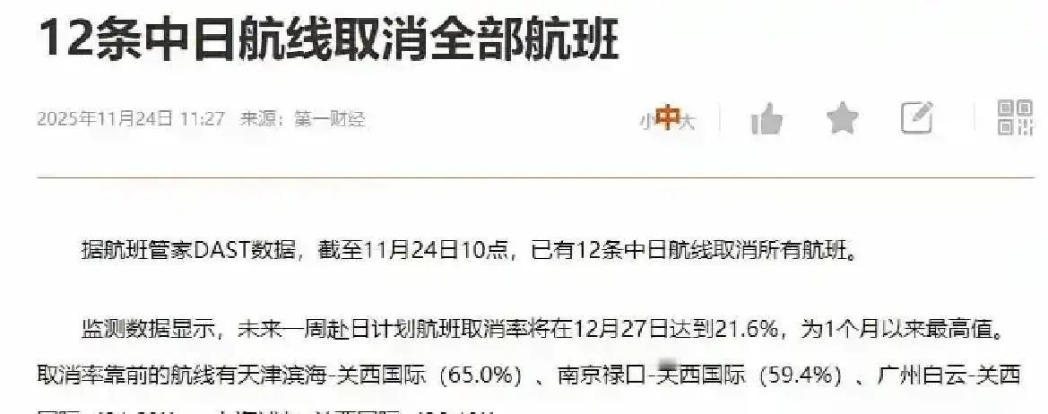 一觉醒来,今天两件大事,高市早苗该有危机感了!第一件大事,12条中日航线取消了;第二件大事,中方已经拒绝参加明年的中日韩三国首脑会议了。中方目前的措施只是“开胃菜”。 这话可不是吓唬人,最近日本旅游圈已经炸开锅了。大阪心斋桥边上有个开民宿的大叔,前几天还跟邻居炫耀樱花季的中国游客订单排到四月底,结果航线取消消息一出,一天退了二十多单,电话被打爆。他对着空落落的院子叹气,说本来指望这波赚够下半年房租,现在只能去工地打零工补窟窿。不光民宿,药妆店货架上的面膜堆得满当当,促销牌挂了一周都没人动——以前中国游客一来就是成箱买,现在连问价的都少。 商务端更糟。东京一家做汽车传感器的小企业,每月要派三个工程师去苏州谈合作,航线没了只能远程视频,但精密零件的安装误差问题,视频里根本说清。老板急得拍桌子,说再拖下去,下个月的订单就要被中国本土企业抢走——这家公司四成收入来自中国,丢了这块蛋糕就得裁员。 三国峰会黄了的影响更隐性。日本经济产业省内部有人透露,本来想借峰会推半导体材料合作,日本有技术,中国有市场,双赢的事儿。现在项目直接搁置,那些等着靠这个项目续命的中小企业,怕是要提前关门。更让人悬心的是,听说中方后续可能限制日本高端机床进口,这对依赖中国市场的日本制造业,简直是掐脖子。 我觉得中方这两步棋够精准。高市早苗这些人眼里只有政治私利,一边喊“合作”一边踩红线,以为中方会一直忍。可他们忘了,日本普通人的饭碗、企业的生存,都和中国市场绑在一起。政客拍脑袋决策,买单的却是老百姓和小老板。 其实日本商界早有清醒的声音,商工会议所会长前阵子还公开说,中日关系不能被政治绑架。但高市早苗他们就是不听,非要跟着美国瞎折腾。现在“开胃菜”已经让他们疼了,要是真等来“主菜”,比如限制汽车或电子元件出口,日本经济怕是要掉层皮。不知道接下来日本国内会不会有更多人站出来反对这种蠢政策,这事儿值得盯着看——毕竟,谁也不想日子越过越难。