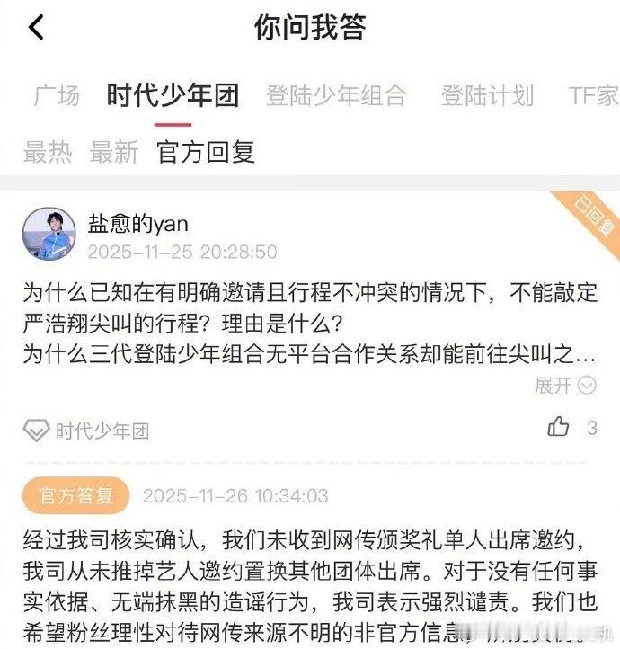 时代峰峻回应严浩翔尖叫之夜时代峰峻说严浩翔未收到尖叫之夜单人出席的邀约 时代峰峻回应严浩翔尖叫之夜,时代峰峻说严浩翔未收到尖叫之夜单人出席的邀约,并说明:“我司从未推掉艺人邀约置换其他团体出席。”