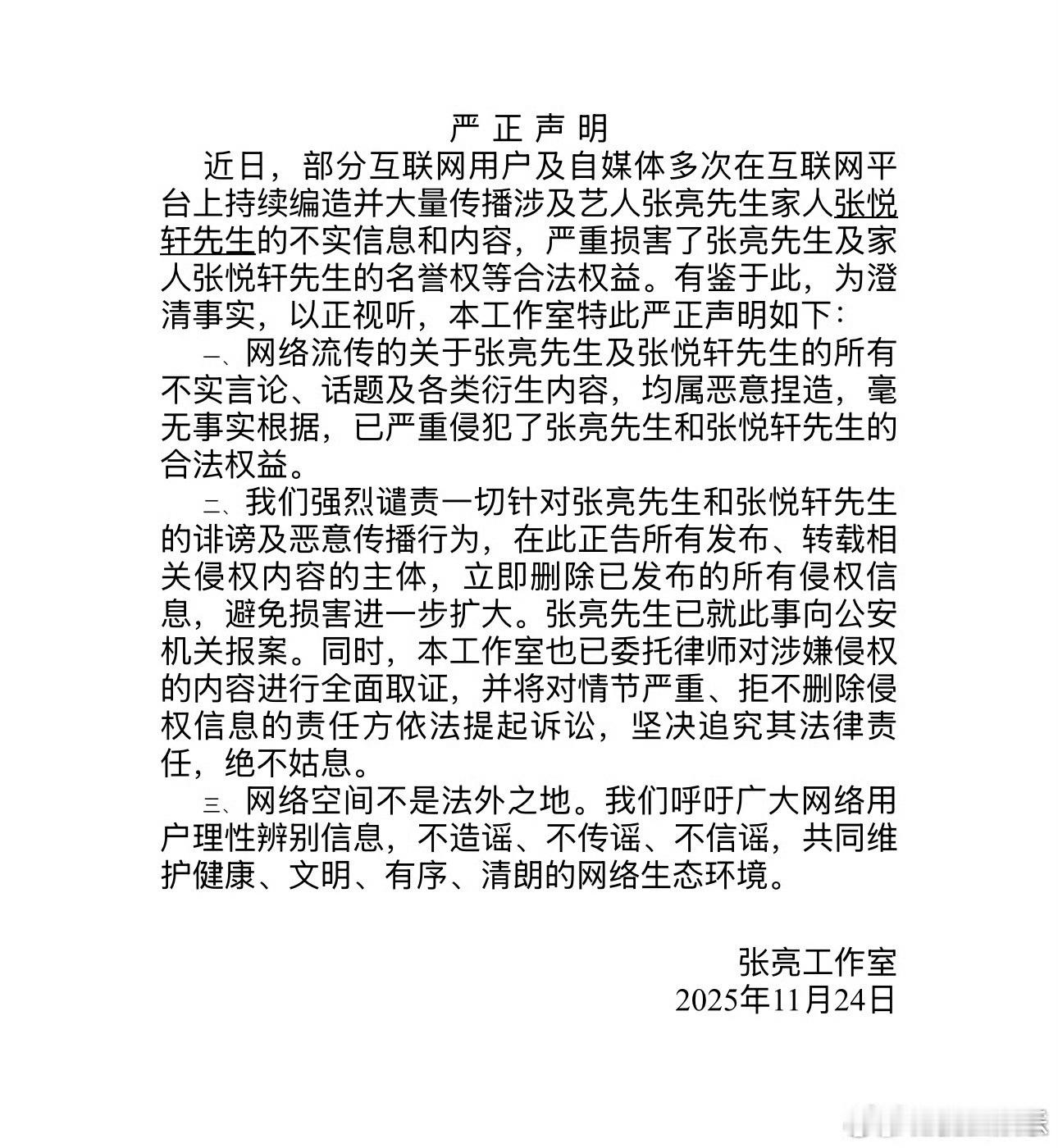 张亮工作室发声明张亮报案今日,张亮工作室发布严正声明:“近日,部分互联网用户及自媒体多次在互联网平台上持续编造并大量传播涉及艺人张亮先生家人张悦轩先生的不实信息和内容,严重损害了张亮先生及家人张悦轩先生的名誉权等合法权益。强烈谴责一切针对张亮先生和张悦轩先生的诽谤及恶意传播行为,在此正告所有发布、转载相关侵权内容的主体,立即删除已发布的所有侵权信息,避免损害进一步扩大。张亮先生已就此事向公安机关报案。同时,本工作室也已委托律师对涉嫌侵权的内容进行全面取证,并将对情节严重、拒不删除侵权信息的责任方依法提起诉讼,坚决追究其法律责任,绝不姑息。”