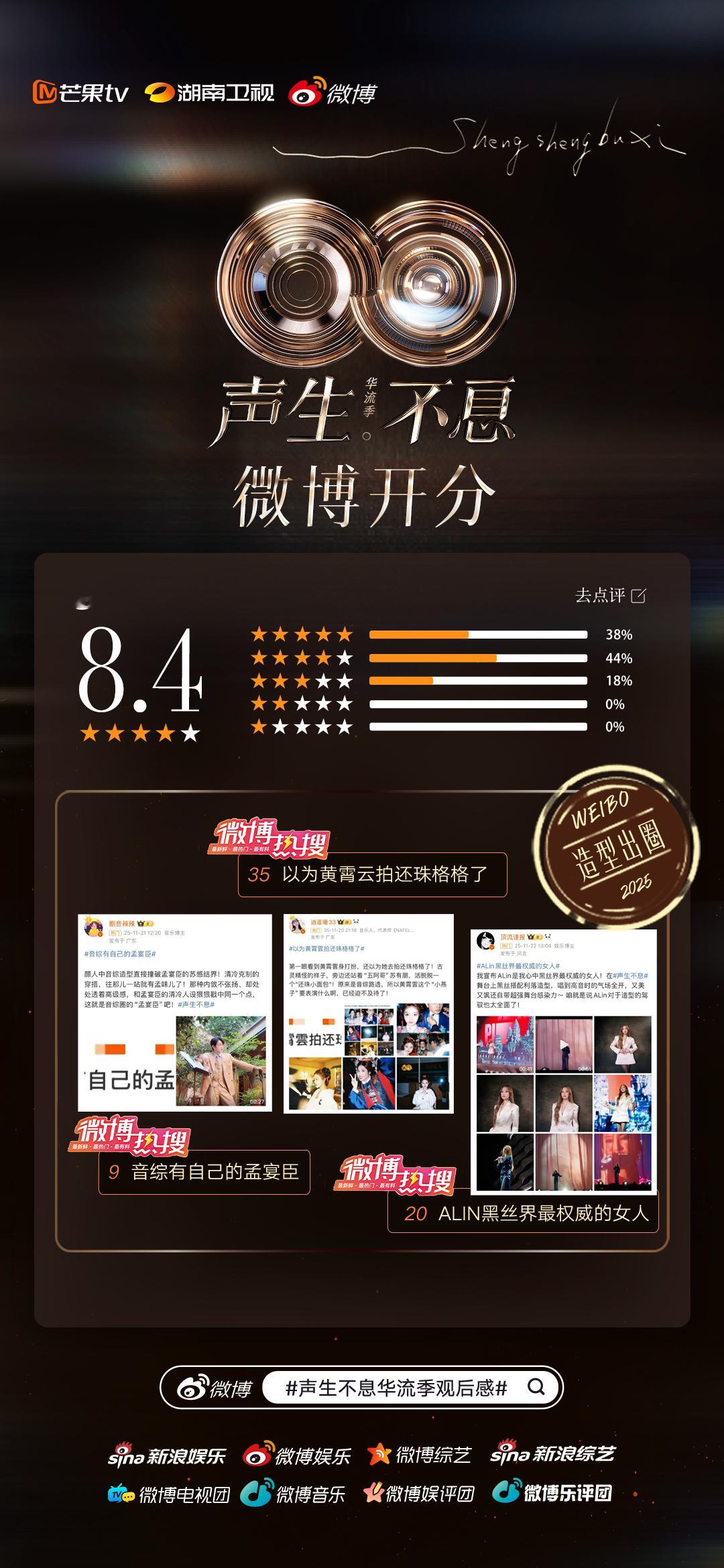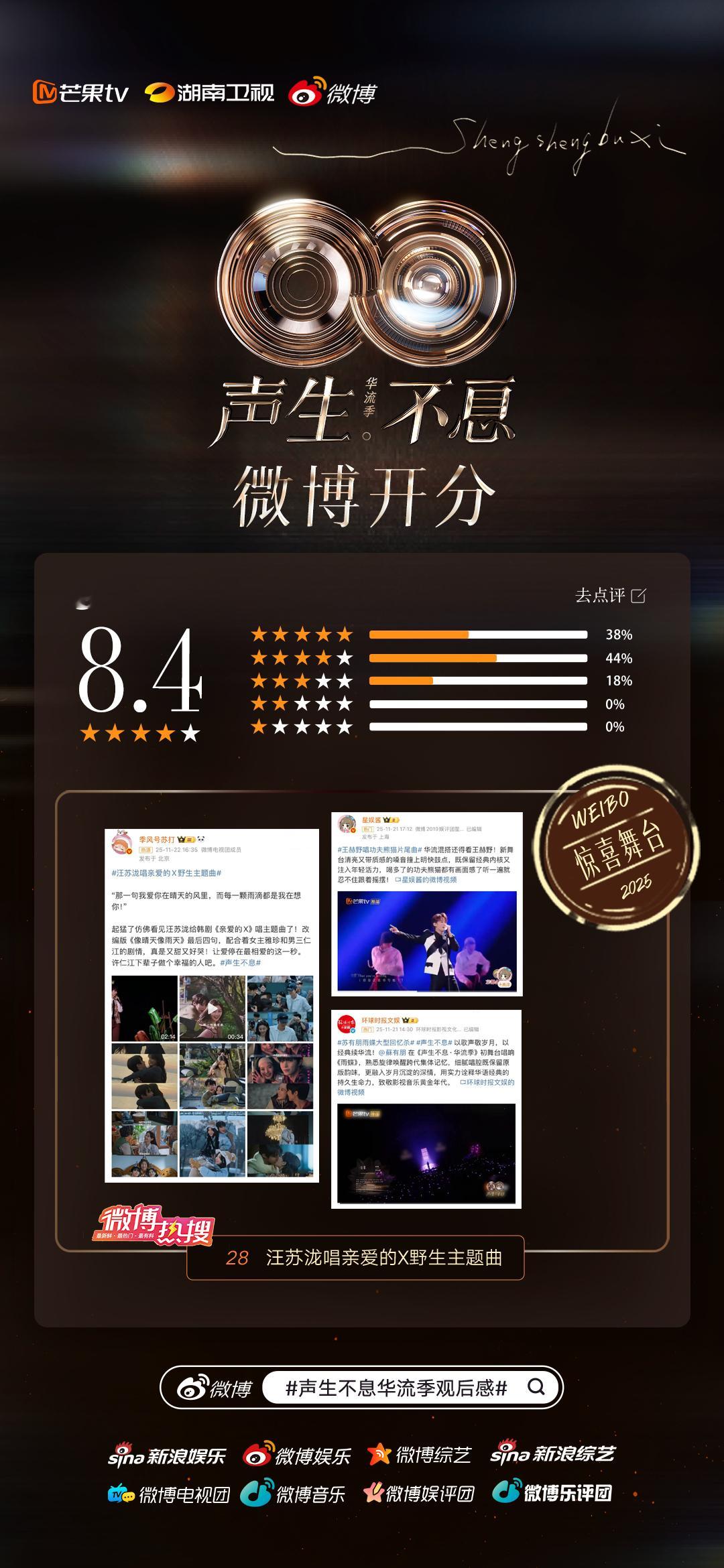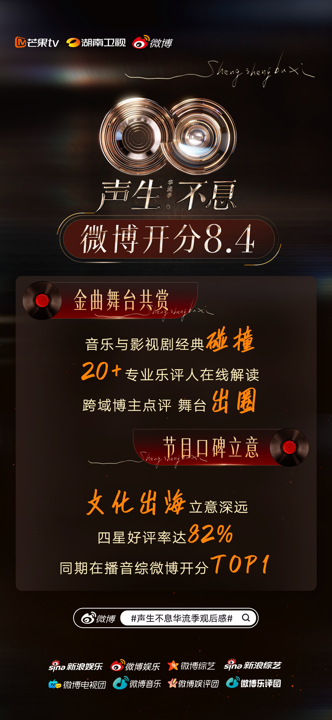 声生不息华流季微博开分8.4 从曼哈顿唐人街的《华人万岁》大合唱,到《爱就一个字》的全场合唱杀,“日月所照,皆有华流”从来不是口号。老中青歌手同台对话,热门金曲与冷门遗珠碰撞,8.4分是听众对纯粹音乐舞台的认可!声生不息声生不息华流季