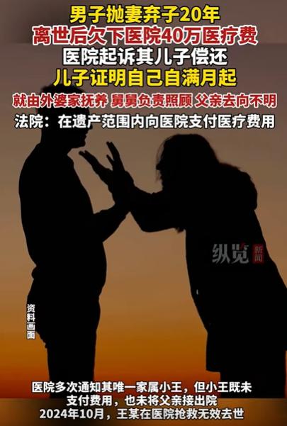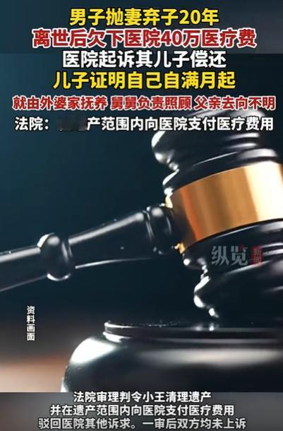 江苏一男子抛妻弃子20年,死后欠下医院40万医疗费,医院要求其儿子偿还,遭到儿子