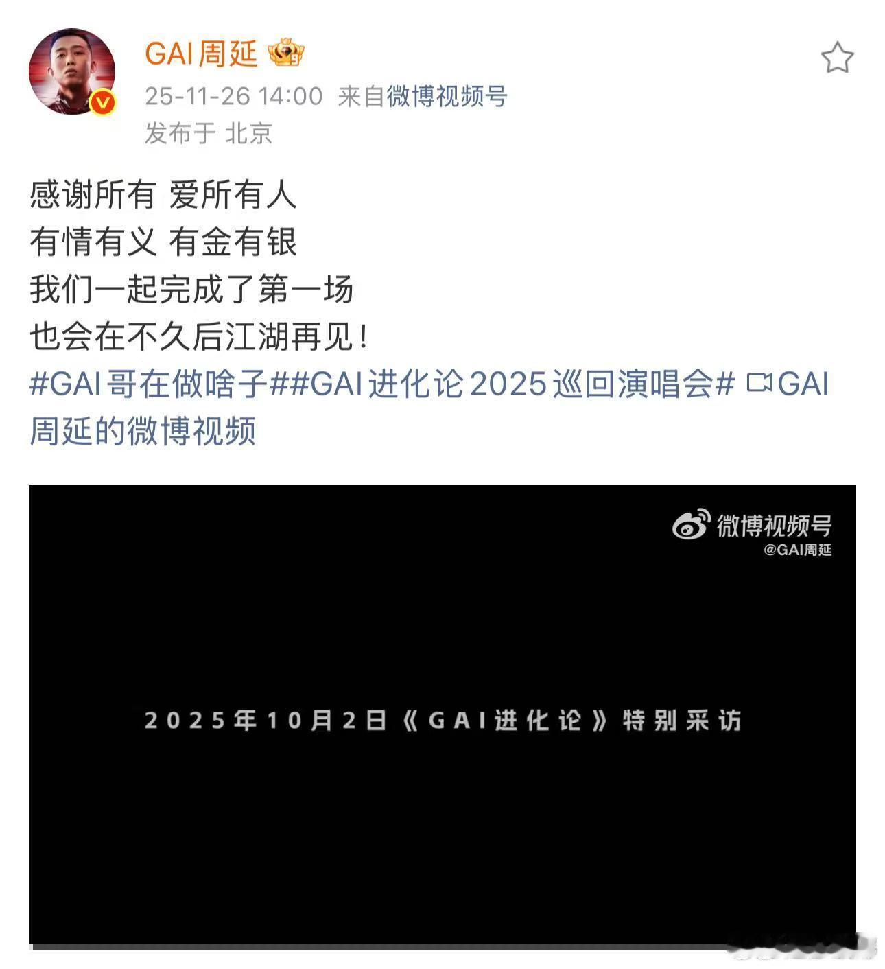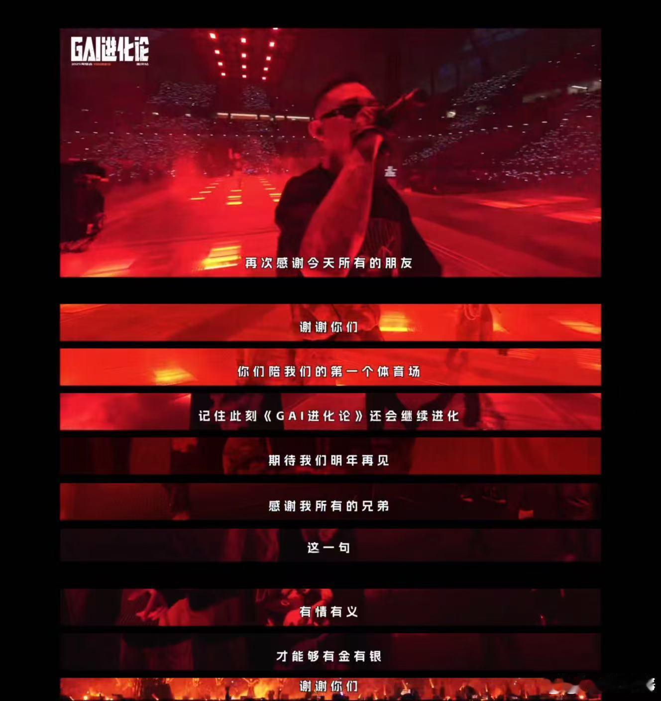 GAI演唱会还没戒断又续上了 纪录片看得太感动了!每次听到GAI谈到自己的经历和情感,心里都涌上阵阵暖意,重庆演唱会不仅是音乐的盛宴,更是情感的交流,真的舍不得离开这个氛围!