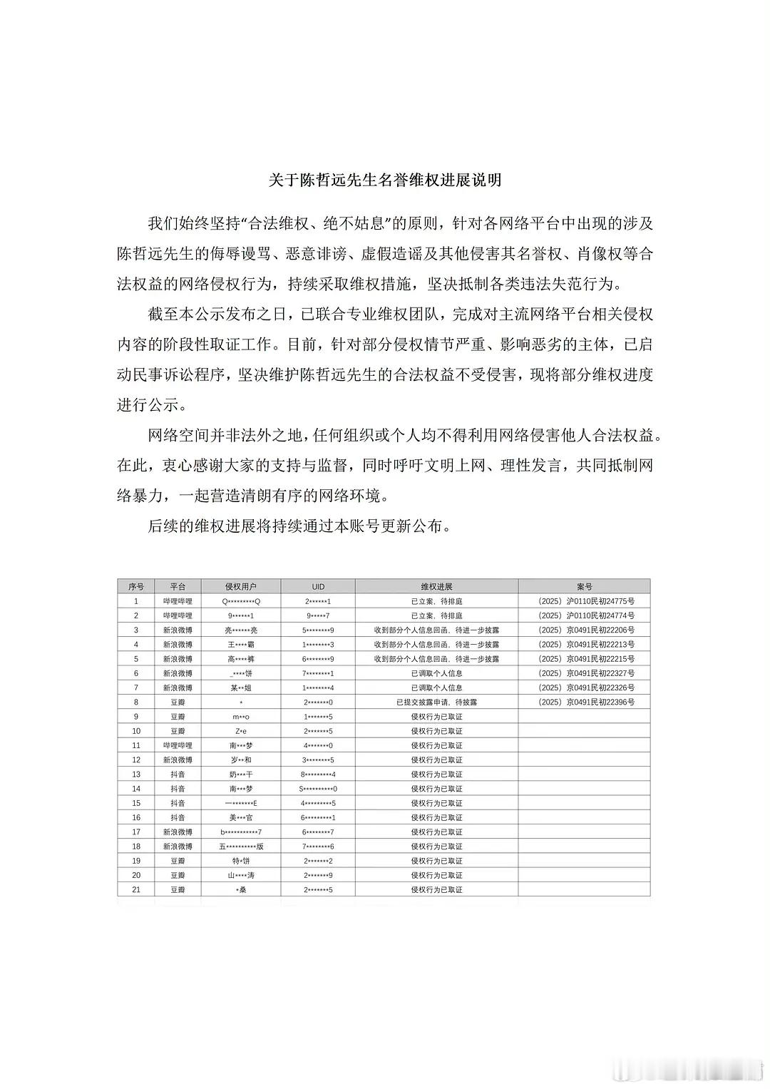 陈哲远维权进度更新,互联网不是法外之地,人都应该为自己的行为负责,支持合理维权!