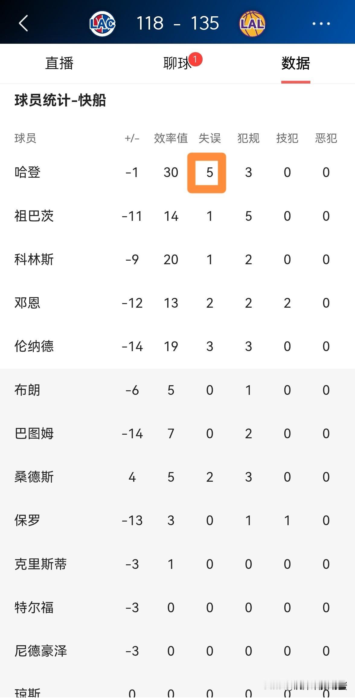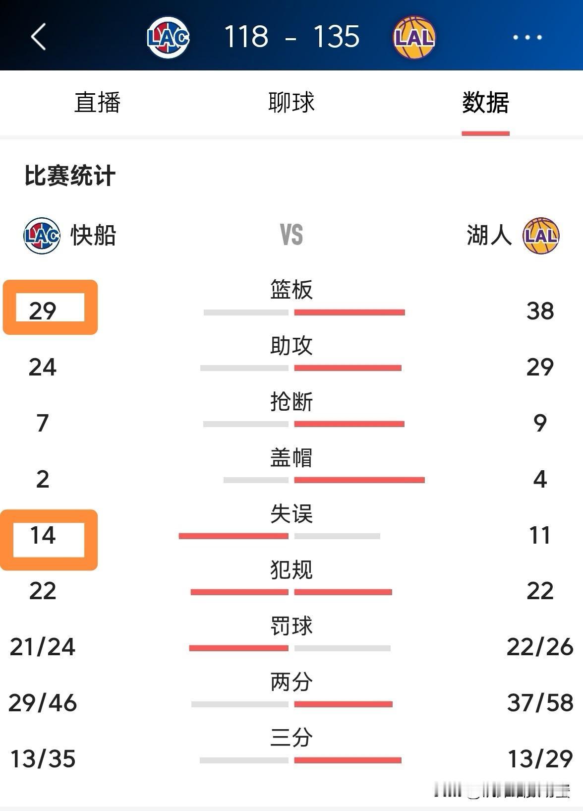快船当家后卫哈登真是一个明白人!在今天快船客场以118:135输给湖人的赛后采访中,哈登聊到了球队输球的原因,只见他一针见血的说道:“进攻篮板和失误。” 正如哈登说的那样,本场比赛快船的进攻篮板仅有7个,而湖人的进攻篮板多达12个,仅仅在进攻篮板方面,快船就比湖人少了好几次进攻机会。此外,在失误数方面,快船也比湖人多,而哈登自己就出现了5次失误。