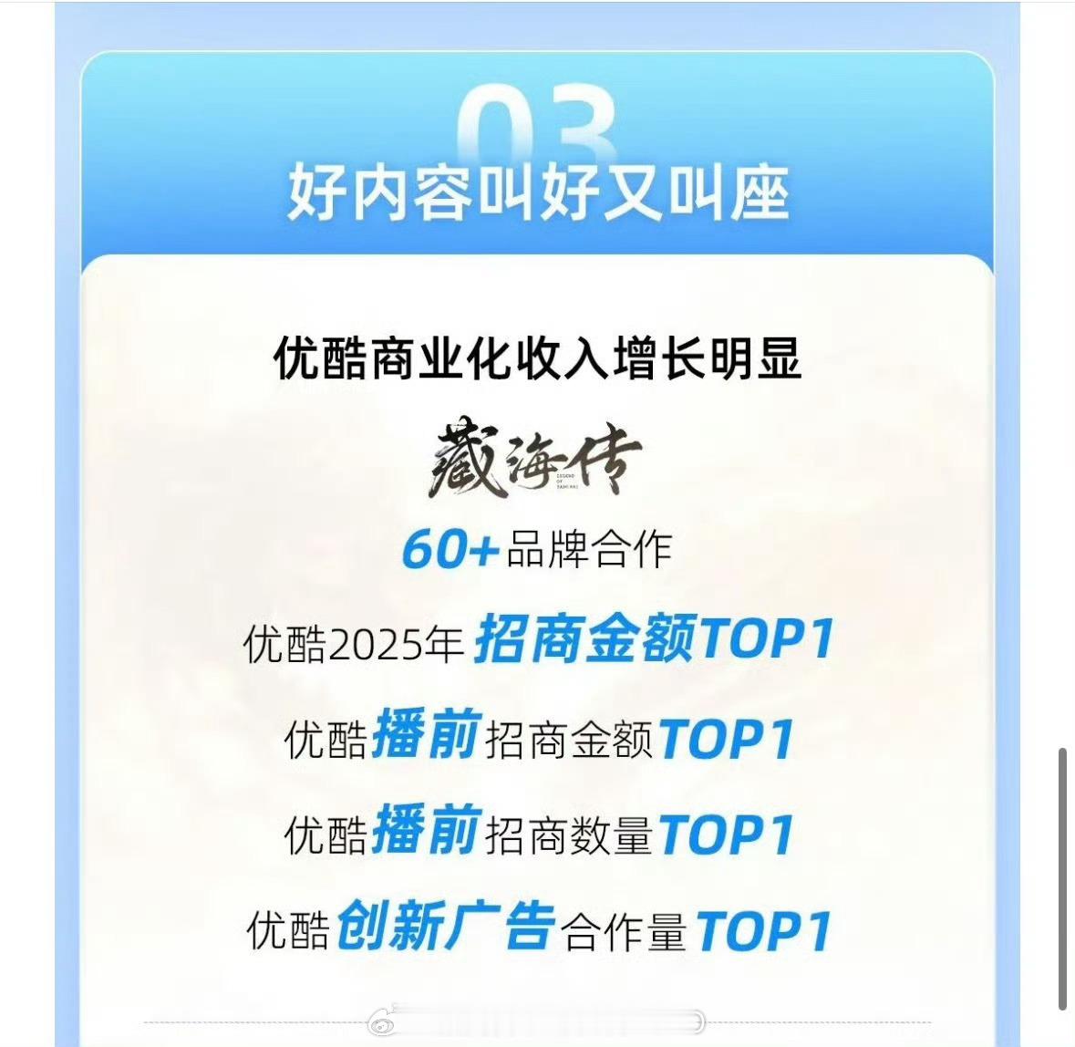 优酷再发战报,再次认证肖战《藏海传》好内容叫好又叫座:优酷2025年招商金额TOP1优酷播前招商金额TOP1优酷播前招商数量TOP1优酷创新广告合作量TOP1 可给👖乐坏了,时不时拿出来炫耀一下的门面剧!!