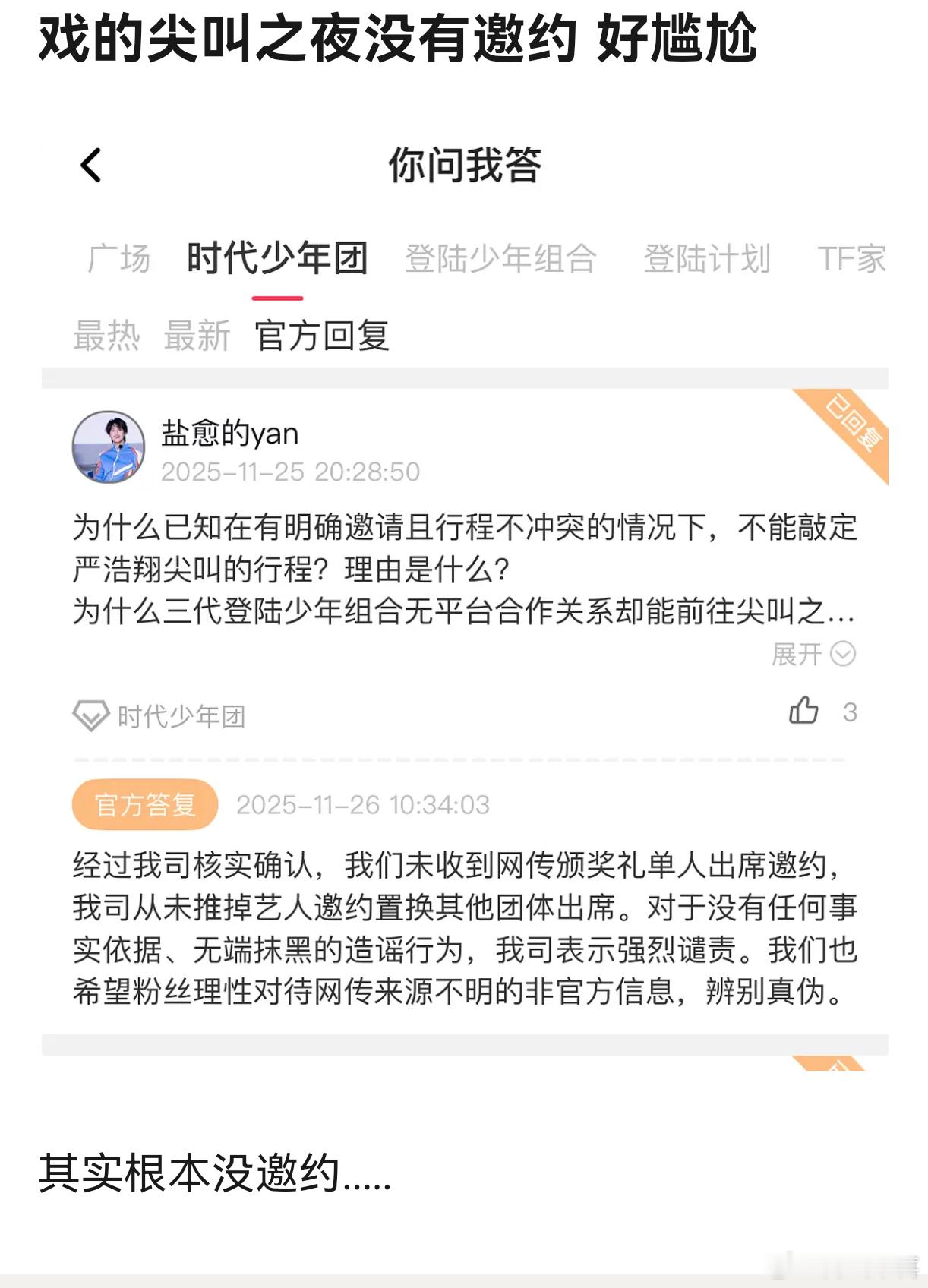 时代峰峻回应严浩翔不去尖叫之夜广场看得我好尴尬啊,都是用一些微信截图红薯截图来证