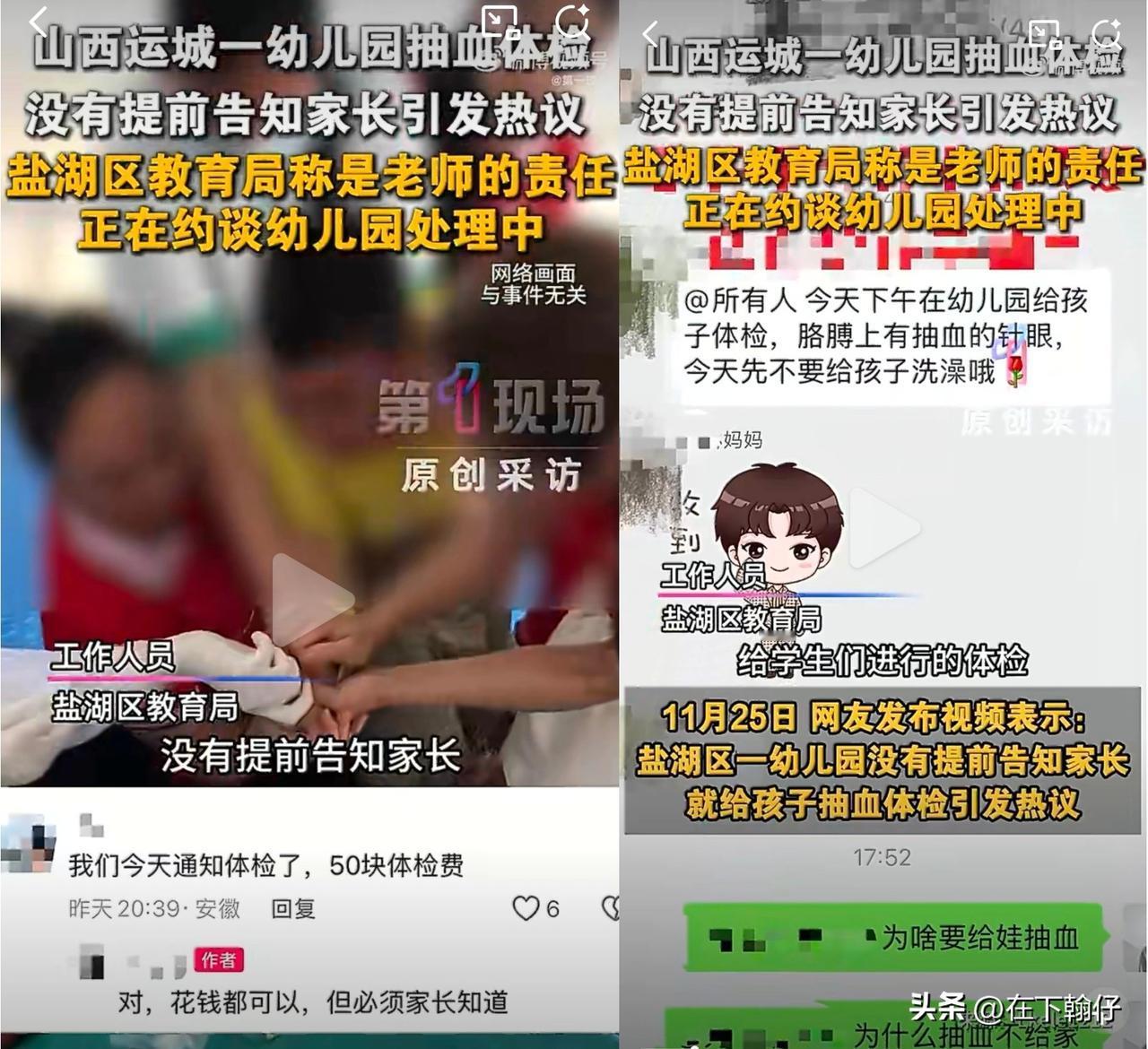 11月25日,山西运城有网友发布视频表示:盐湖区一幼儿园在没有提前告知家长的情况下,给孩子抽血体检,事发后,家长们在群内纷纷质问。 11月26日,盐湖区教育局工作人员回应称:接到卫健委的通知,给学生们进行的体检,老师工作疏忽,没有提前告知家长,确实是老师的责任。目前正在约谈幼儿园处理中,并承诺今后会提前告知并采取自愿原则。 尽管教育局解释了体检的合规性,但家长对园方“先斩后奏”的行为仍难以接受。有网友直言:“通知体检可以理解,但隐瞒操作就是失职!” 孩子抽血这么大的事,家长居然不知情?谁给的胆子私自做主啊,孩子的健康和家长的知情权都不当回事吗? 作为孩子的第一监护人,幼儿园确实应该跟孩子家长提前打招呼,不要说抽血了,打疫苗、喂药也必须经过监护人同意。