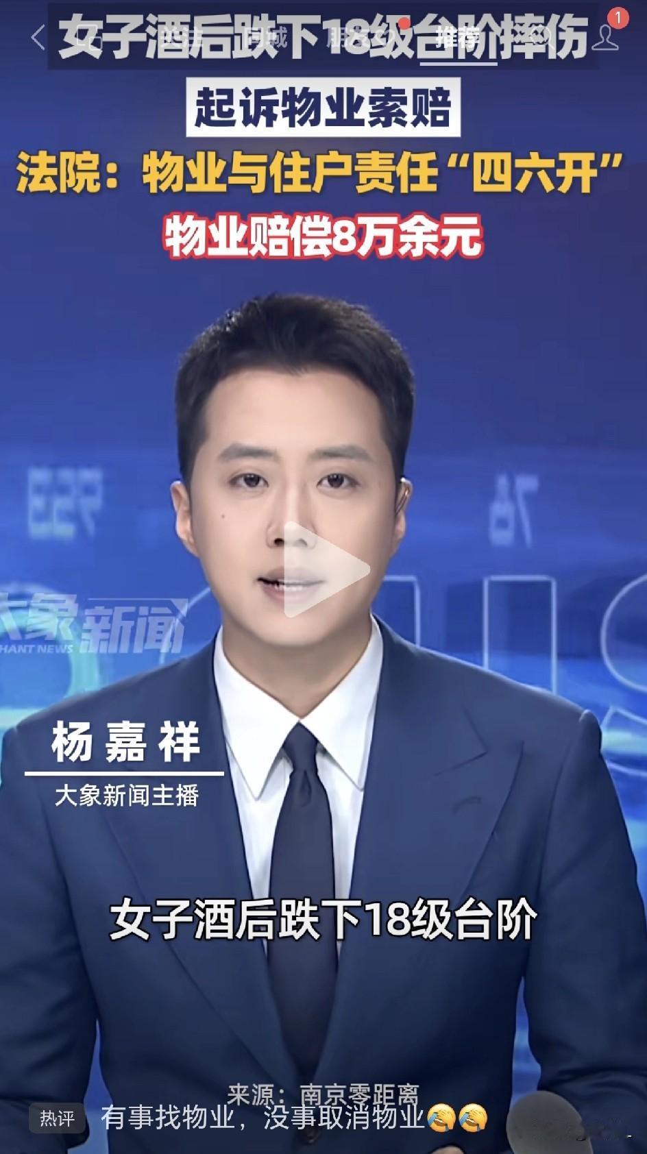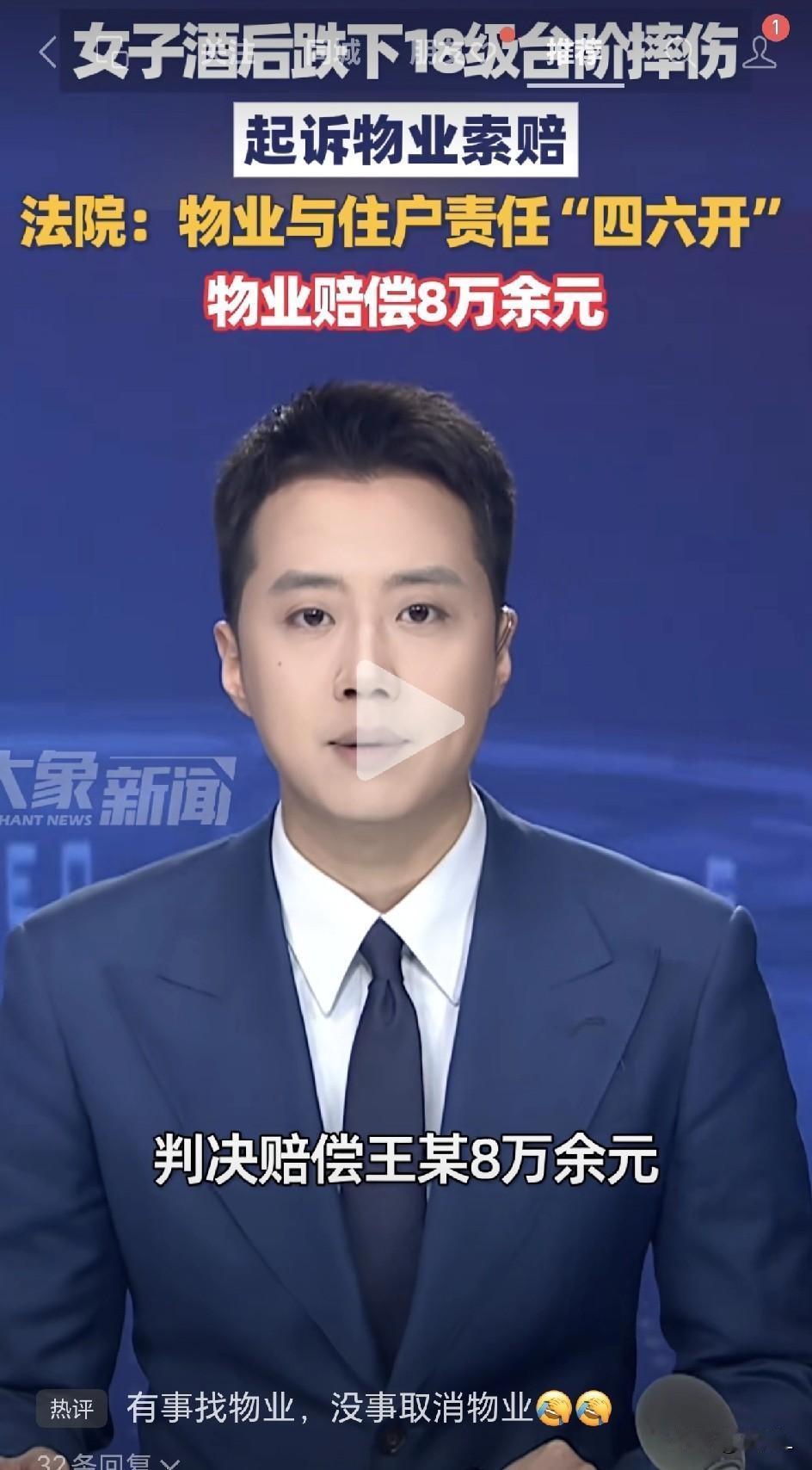 女子酒后走消防通道摔残,反告物业索赔26万!法院判决:物业赔8万,只因消防通道这两处“致命”疏忽。 江苏昆山,女子因酒后抄近道走消防通道,不慎跌落18级台阶,至全身多处骨折,十级伤残。将物业告上了法庭,索赔26万。 近日,法院二审公布,维持一审判决,物业担责40%,赔付女子8万,驳回其他诉求。 女子王某长期租住在江苏昆山某小区,一日夜晚饮酒后下楼扔垃圾,为图方便抄近道,就从敞开的消防通道下去。 但因为消防通道内没有照明设施,王某在下负一层楼梯时,不慎从台阶上滚落受伤。经医院诊断,王某右桡骨远端骨折、头皮血肿、皮肤挫伤,后鉴定为十级伤残。 王某认为:物业公司管理不当,消防通道无照明,且消防通道门未保持“常闭”状态,故要求物业公司赔偿相应损失。 物业公司辩称:王某在饮酒后抄近路走消防通道,对自身安全疏忽大意,其存在重大过错。另外,该楼梯交付时就没有设置照明灯,且楼梯无损坏、路面无障碍物,事发后物业人员立即到现场进行救助,已尽到合理的安全保障和管理义务。 双方无法协商一致,2025年2月,王某就将物业告上了法庭,要求物业公司赔偿各种费用合计26万余元。 法院调查发现,王某长期租住在本小区,对周边环境熟悉。而且其酒后外出当晚,楼道大门正常敞开状态,王某为了图方便,还是去走了明知没有照明灯的消防通道,失足跌落。王某作为完全民事行为能力人,对意外负有主要责任。 而物业,未保障消防通道的照明,也没有让消防通道大门保持常闭状态,亦存在过错。 所以,法院判决物业公司担责40%,赔付王某8万。 王某对判决不服,提出上诉。但二审结果,依然是维持了一审的判决结果。 楼道的消防通道大门,应该本身是具有自动常闭功能的。王某小区的消防通道大门为什么能够处于敞开的状态,确实让人费解。 像我家楼下的对讲门,本身是具有自动常闭功能的,但是就是有用户图方便,或者嫌弃关门声太大,就捡来砖头挡着门,不让它关闭,最终导致对讲门损坏。 而王某在明知消防通道没有灯、自己还喝了酒的情况下,非得走消防通道,最后出了事,却把物业告上了法庭。 物业冤不冤?冤,也不冤! 说它冤,是因为,这事是王某自作自受,是她本人明知有风险,却依然我行我素,心怀侥幸。 说它不冤,是因为没有照明灯确实是工作失误,不能说开发商交付没灯就能摆脱责任。作为服务公司,基本的照明保障没做到就是有错。而消防门为什么会是敞开的状态?即便是居民自行敞开的,物业公司也有责任做好监管工作。 法院把责任“四六开”的判决是一个平衡各方利益、符合法律精神和公众普遍认知的公正裁决。 它既惩罚了物业的管理失职,也警示了个人要对自身安全负责。 这8万元的赔偿,不仅是给王某的经济补偿,更是对物业公司管理失职行为的一种法律认定和惩戒。 信息来源于大象新闻,侵联删!