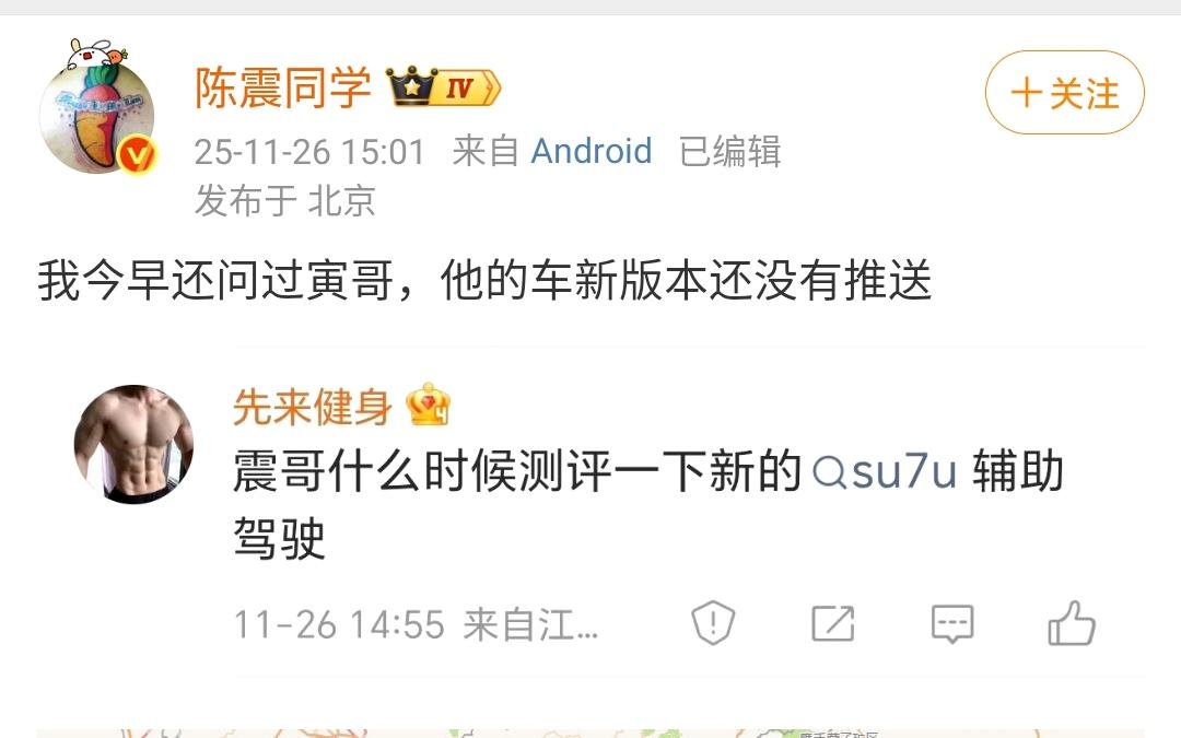 网友问陈震什么时候可以测试一下小米SU7 ultra 辅助驾驶? 陈震:我今早还问过寅哥,他的车新版本还没有推送。 大家都挺关心小米的辅助驾驶新推送版本的,据已经获得推送的车主介绍,以前的如果是75分的话,现在已经可以打85分了。 现在即使是在市区内开车也愿意使用了,相当于现在成为了一个3~5年的司机开车的水平。 不过小米SU7 ultra 具体有些什么区别还是值得关注的。 各位是怎么看的?欢迎评论区留言。