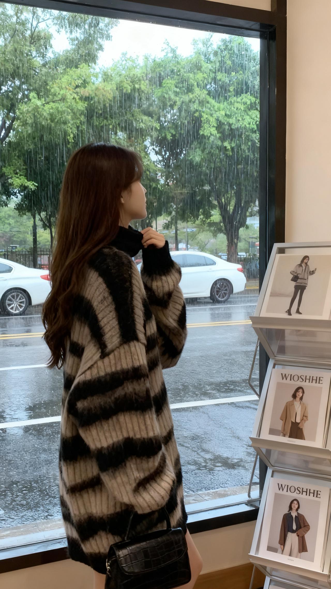 午后的咖啡馆,偶遇文艺女神!她坐在窗边,一身灰色毛衣搭配黑色围巾,简约又不失气质