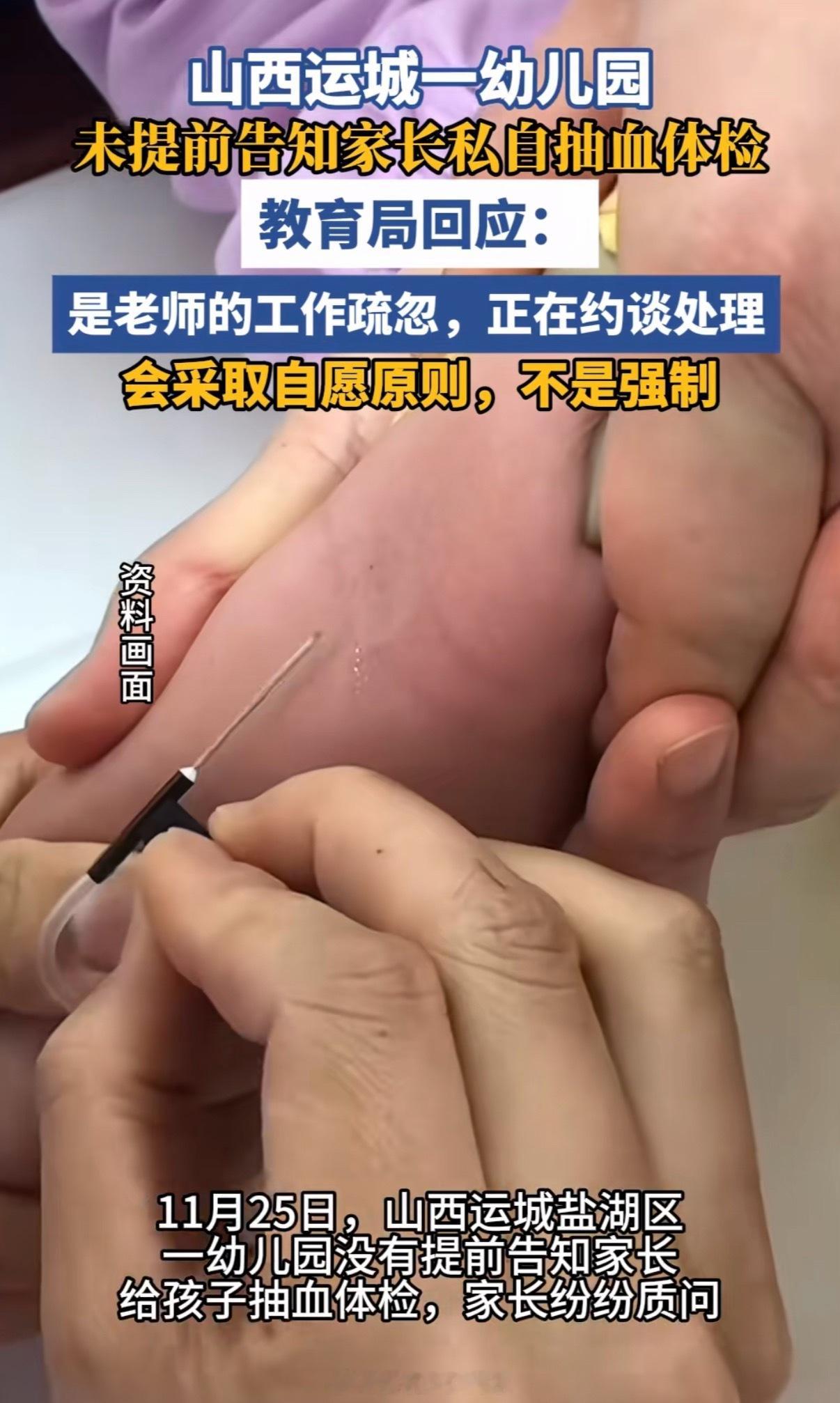 幼儿园未告知家长私自抽血体检:未成年人的身体健康管理权是孩子的父母!任何单位或个人无权避开父母或监护人对孩子进行血液检查!学校这是违法!
