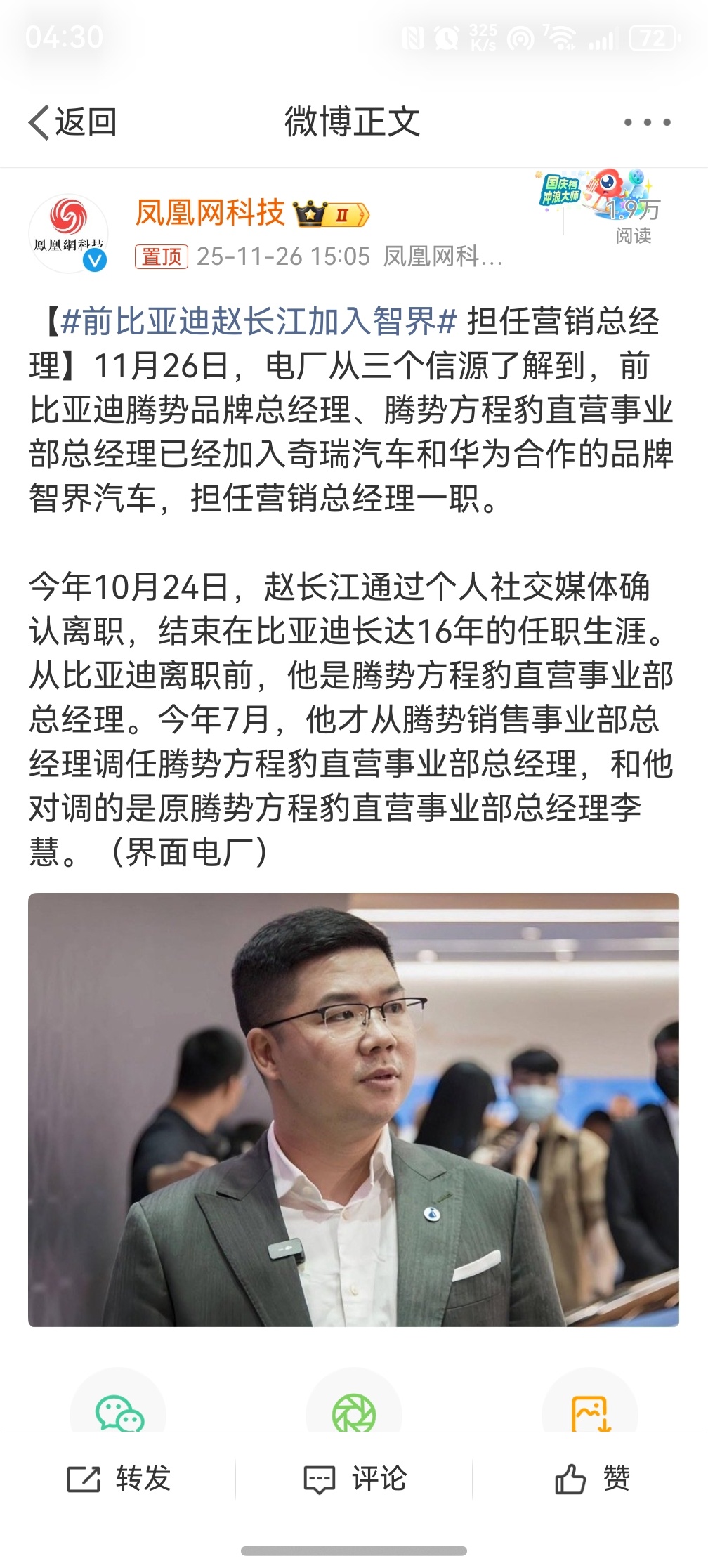 前比亚迪赵长江加入智界 看来小道消息很准确啊,赵长江入职智界,担任营销总经理