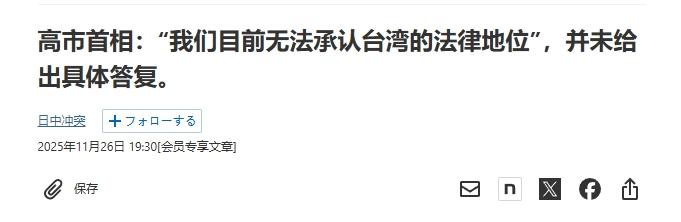 高市早苗确认不了台湾的“法律地位”? 高市早苗仍在诡辩。中方驳斥日方所谓立场未变言论 据日本《经济新闻》消息,26日高市早苗在参加国会答辩时声称,由于日本根据《旧金山合约》放弃了对台湾的所谓“权利”,所以日方“并不具备确认台湾‘法律地位’的立场”。MCN双量进阶计划 高市早苗这句话,可以说是继她那句“台海事关日本存亡危机”之后,另一个性质极其恶劣的表态。 她所谓的“日方并不具备确认台湾‘法律地位’的立场”,其实质就是美西方的“台湾地位未定论”那套话术,用美日单方面签署、且中方不承认的《旧金山合约》干涉台湾问题。 但事实上,无论是《开罗宣言》《波茨坦公告》,还是联合国第2758号决议,亦或者是中日四个政治文件,均确认台湾是中国领土,日本承诺奉行一个中国政策。 如今高市早苗尚未就其涉台错误言论道歉,又抛出“台湾地位未定论”的诡辩话术,不仅是日方对自身政治承诺的严重倒退,更是对中日关系政治根基的恶意掏空。 我们之前已经解释过,如果高市早苗不承认中日四个政治文件的精神,就等于接受中方可以诉诸武力解决中日之间的某些矛盾。