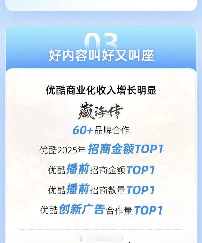 优酷又发战报了!!优酷藏海传战报优酷再次认证肖战的藏海传是:【优酷2025年招商金额TOP1】【优酷播前招商金额TOP1】【优酷播前招商数量TOP1】【优酷创新广告合作量TOP1】 (还有亮点,藏海传是5月播出的剧集,仅靠长尾效应就让优酷在暑期档摘得全网有效榜单的播放量前2)