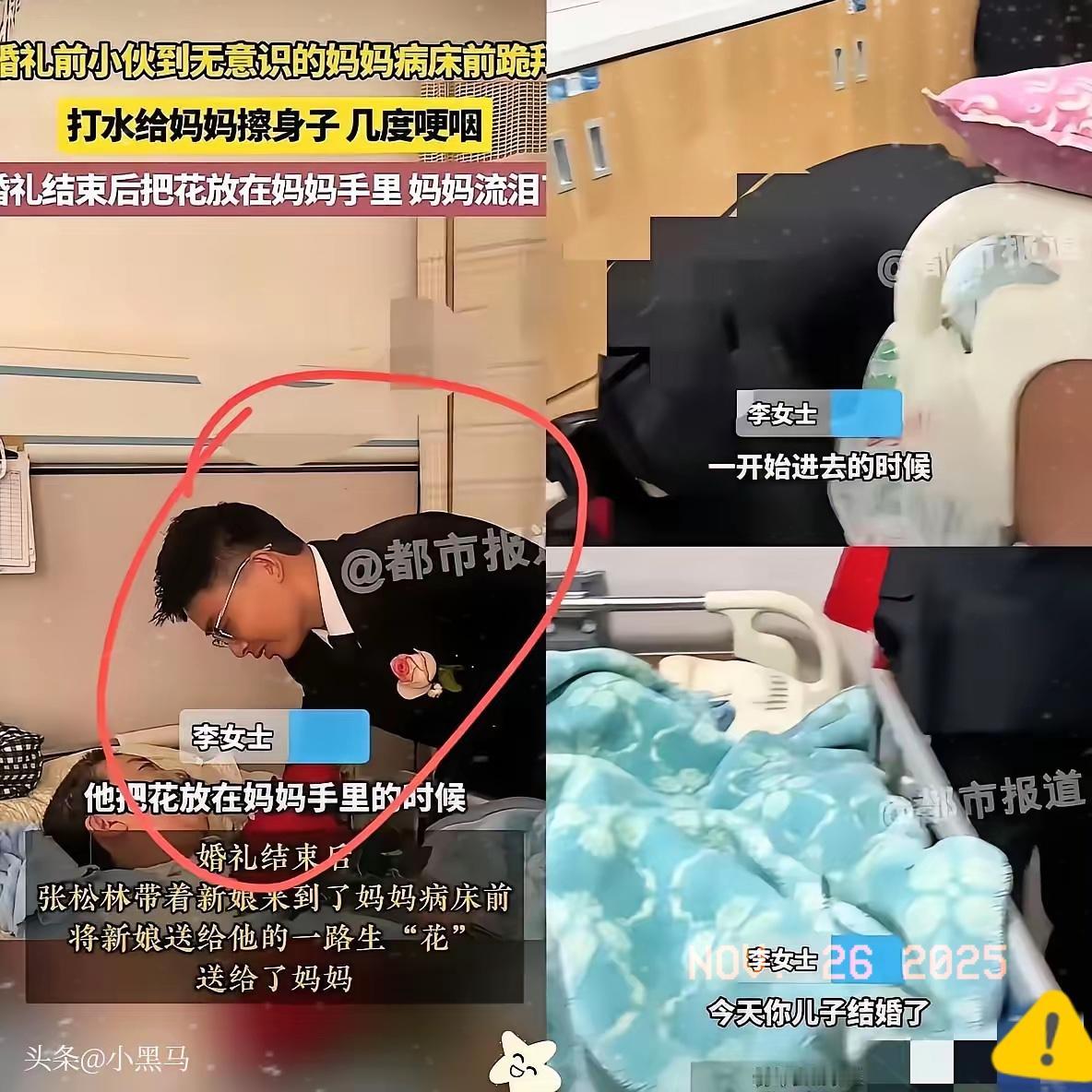 泪目!河南一男子今天结婚,一大早打扮得帅帅气气的,却没先去接新娘,反倒第一时间冲到了医院,对着昏迷多年、毫无回应的妈妈,他双膝跪地,凑到耳边轻声喊:“妈,我今天结婚啦,你看看我帅不帅?” 他絮絮叨叨说着成家的心愿,仔仔细细给妈妈擦身、安顿好一切,才匆匆赶去接新娘! 婚礼本是新人的主场,可他心里最牵挂的,是昏迷多年的妈妈。跪地轻声喊“妈,我结婚了”,仔细擦身安顿好,才赶去接新娘,婚礼一结束又立马折返——这哪是“傻”,分明是刻在骨子里的孝顺。 更难得的是新娘,没有一句怨言,还跟着一起给婆婆暖心喊话。其实结婚从不是“脱离原生家庭”,而是带着最亲的人走进新生活。那些说“作秀”的人,大概不懂:妈在,家才完整,这份仪式感,比任何排场都珍贵。 你觉得结婚当天最该坚守的初心是什么?来评论区聊聊~