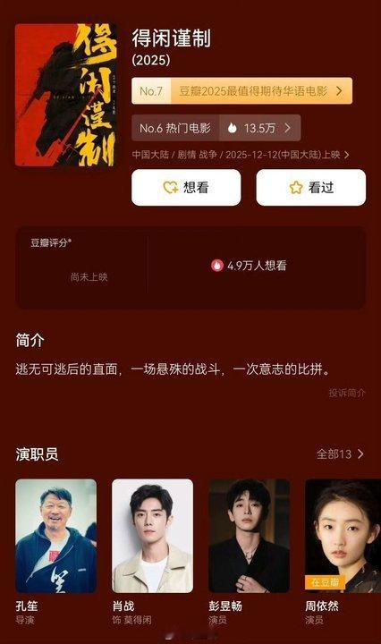 娱乐网传得闲谨制12月12日上映网传肖战新电影《得闲谨制》12月12日上映,抗日