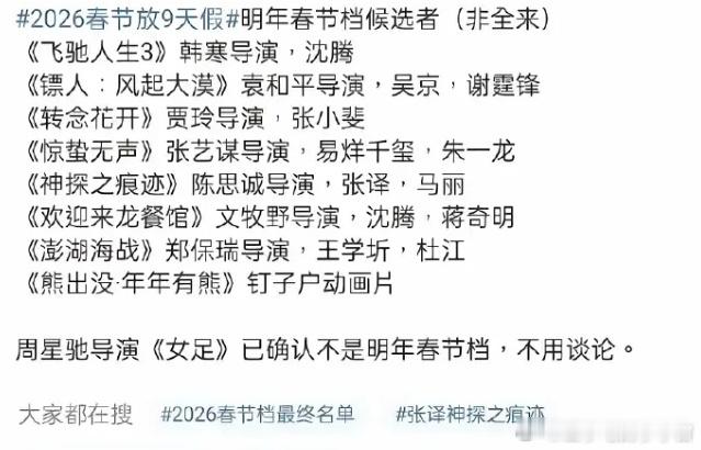 都在说2026春节档竞争激烈其实也不理解,翻来覆去还是那几个人,沈腾,吴京,贾玲,易烊千玺,朱一龙,张译,马丽,张小斐,连续十年来,春节档不就这些人吗,这次导演阵容也很强大,张艺谋,郑保瑞,袁和平,文牧野,陈思诚,韩寒,贾玲,电影圈很小,小到春节档一直都是这些演员轮流上。