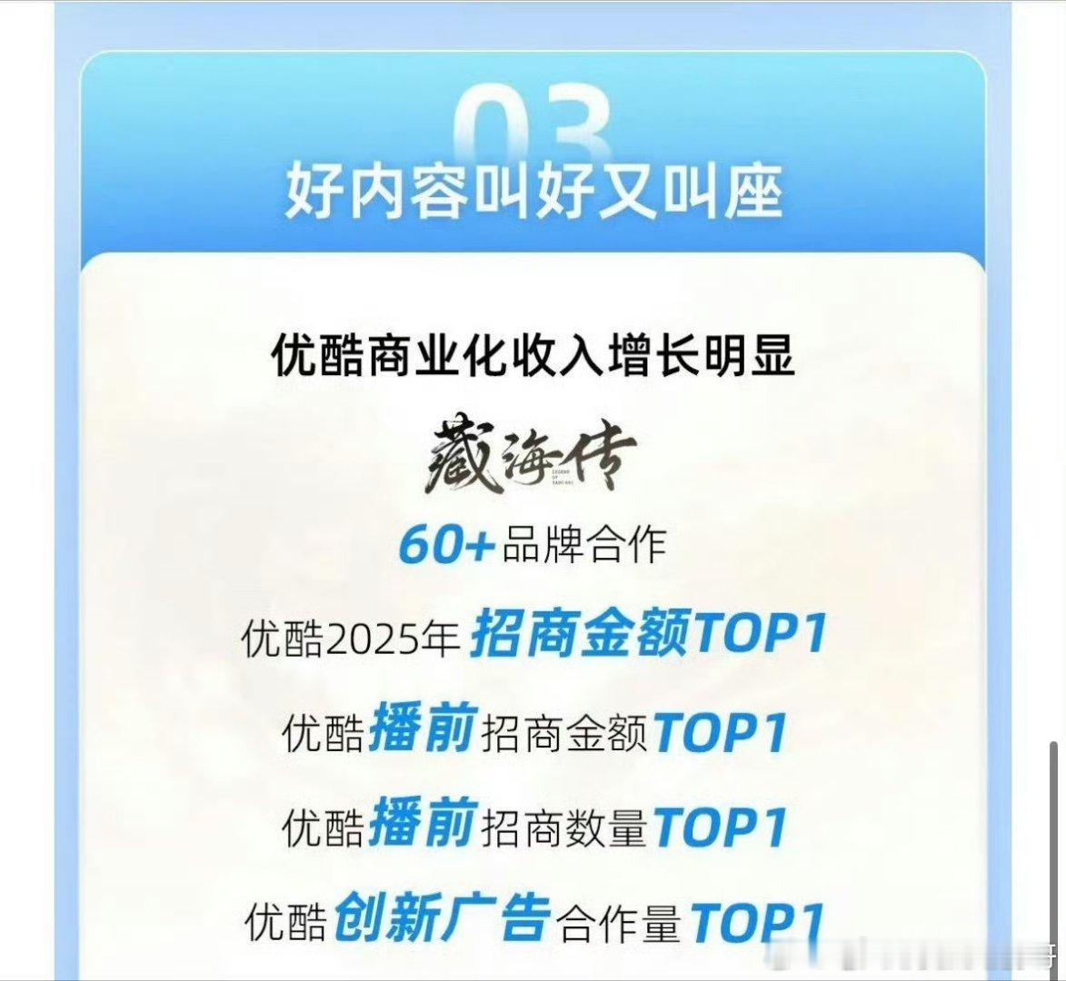优酷又又又又给肖战《藏海传》发战报了优酷2025年招商金额TOP1☝️优酷播前招商金额TOP1☝️优酷播前招商数量TOP1☝️优酷创新广告合作量TOP1 ☝️时不时拿出来炫耀一下的门面剧