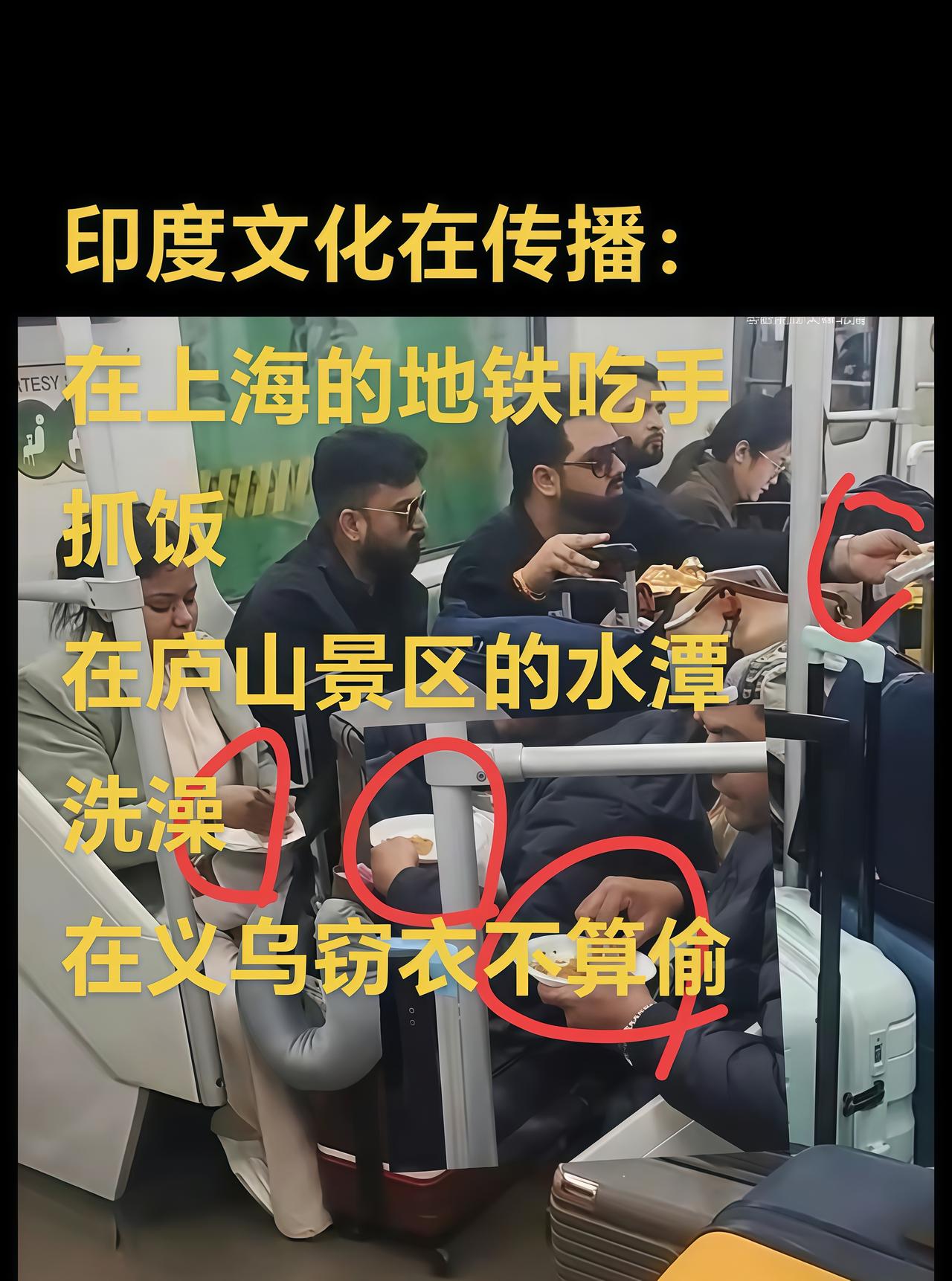 上海地铁内, 一群印度人正用手抓饭! 地铁车厢里,一群印度乘客正吃着手抓饭,还彼此分享。 地铁有明确规定,禁止在车厢内饮食,这种行为是否对国内乘客有失公平? 地铁广播常作相关提示,为何他们对此充耳不闻?从穿着来看,他们似乎属于印度的高种姓人群。 长此以往,未来是否会在街头巷尾见到更多类似行为?人们对公共环境卫生和秩序的担忧也由此而生。