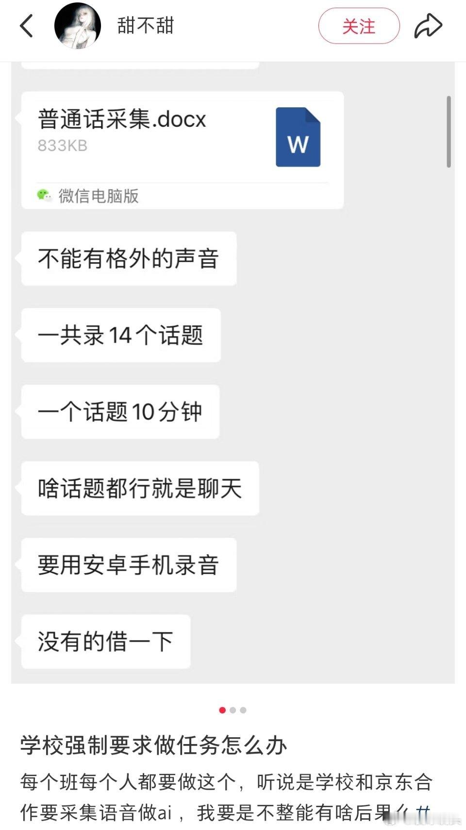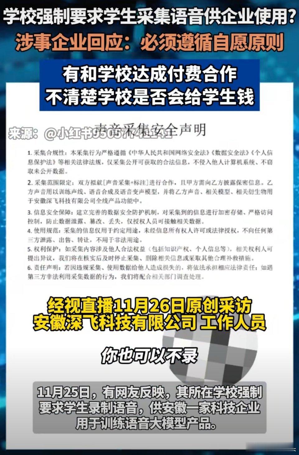 学校强制采集学生语音训练大模型看来学校强制采集学生语音训练大模型并不是一家两家的问题。公司是出了钱的,这没毛病。关键是学校方面强制学生配合采集语音,1分钱不付,问题就很大了。
