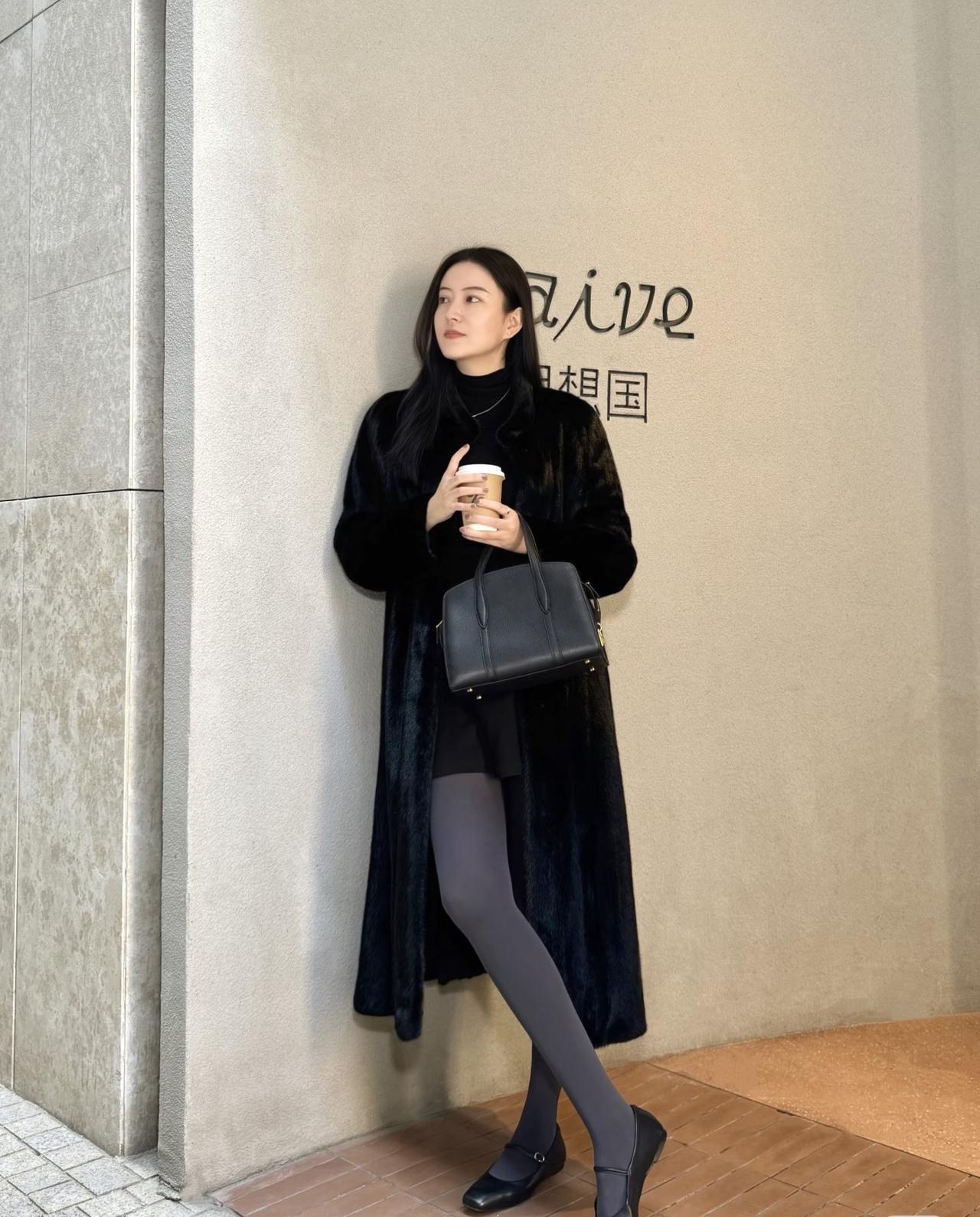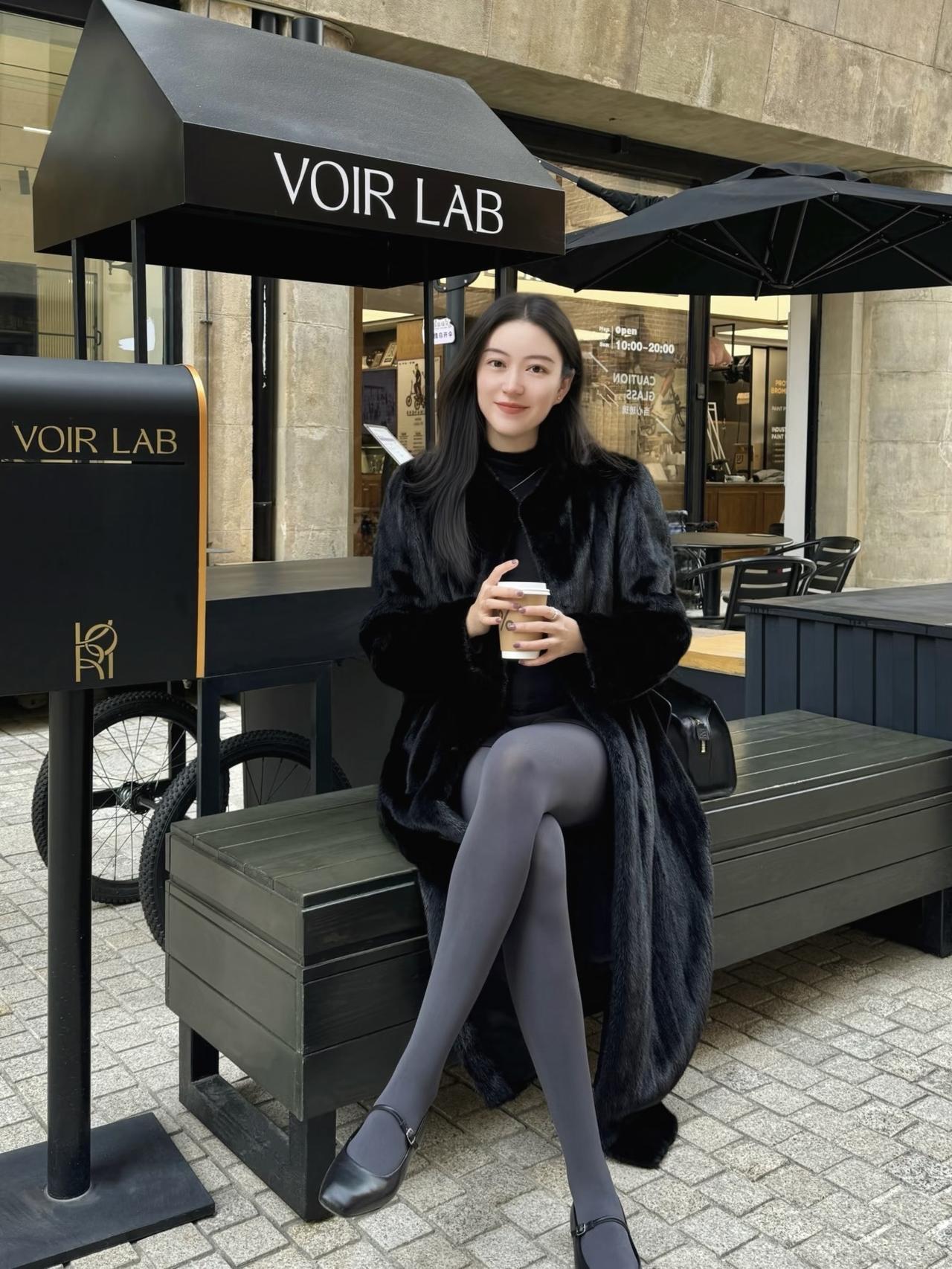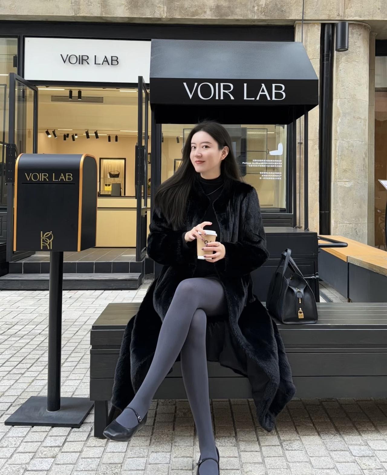 当然是黑色打底毛衣+外套黑色大衣+灰色连体袜不仅仅时尚还保暖