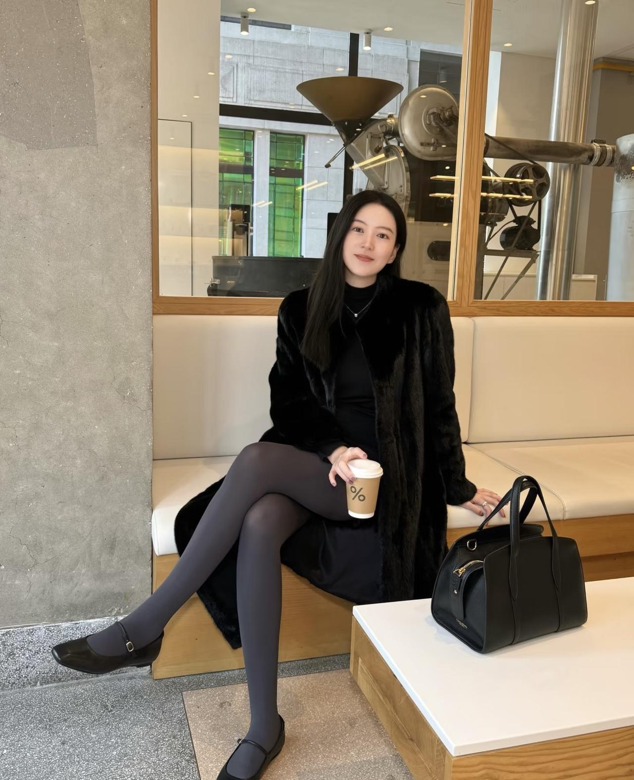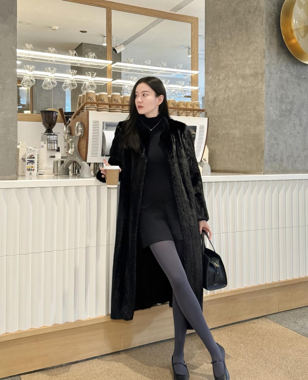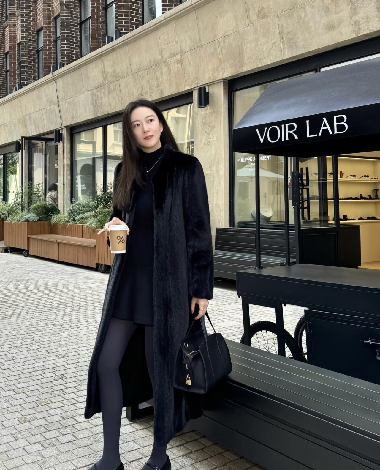 当然是黑色打底毛衣+外套黑色大衣+灰色连体袜不仅仅时尚还保暖