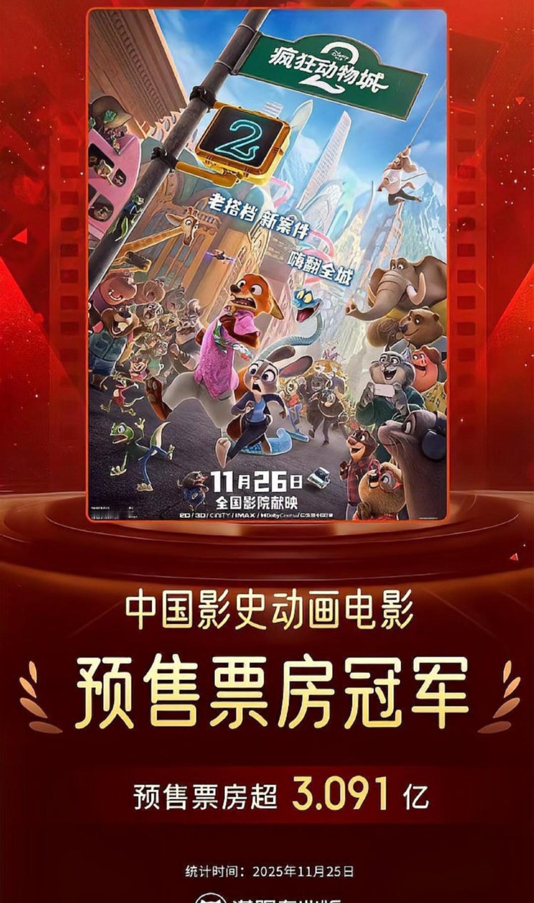 《疯狂动物城2》预售票房已破3亿,超越《哪吒2》成为国产动画新挑战者,迪士尼如何再创票房神话? 自11月17日起,《疯狂动物城2》凭借9小时破千万、总预售超4000万的成绩,打破了多项进口片纪录,其中《复仇者联盟4》保持的进口片预售纪录亦被其轻松超越。这一成绩不仅令其成为中国影史首部预售票房破2亿元的进口动画电影,还使其预售票房位列过去三年喜剧片第二位,仅次于《哪吒之魔童闹海》。相比之下,《哪吒2》首日预售仅突破8000万,尽管在一二线城市表现强劲,但其在下沉市场开始显露疲态。迪士尼通过与中国院线的深度合作、方言版放映及预售策略革新,成功逆袭国产动画,为《疯狂动物城2》的预售奇迹提供了坚实支撑。