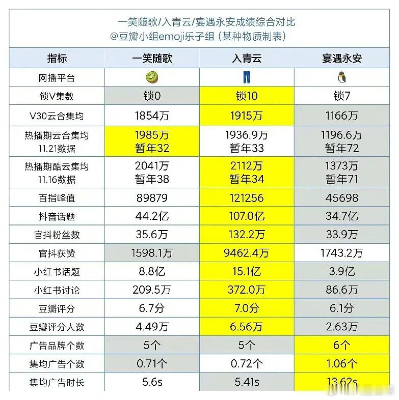 《一笑随歌》《入青云》《宴遇永安》各项成绩综合对比