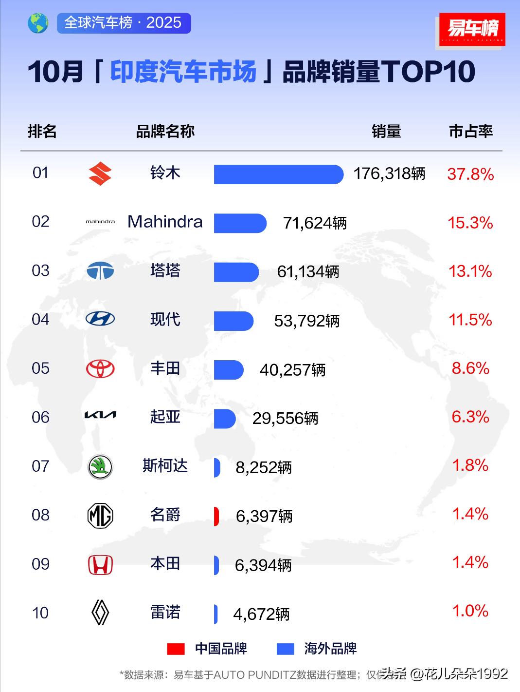 铃木汽车居然在印度卖的这么好,超过了他们本地的塔塔集团。 2025年10月及1-10月印度汽车市场品牌销量TOP10 根据易车基于AUTO PUNDITZ数据整理显示: 10月品牌销量前3名为:铃木、Mahindra、塔塔,销量分别为:176318辆、71624辆、61134辆 1-10月品牌销量前3名为:铃木、Mahindra、现代,销量分别为:1456898辆、518321辆、479122辆 印度汽车业 铃木回归中国 铃木 铃木停产 印度上汽