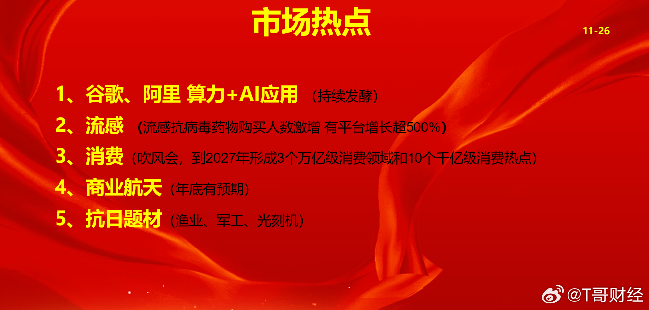 今晚讲课重点讲了谷歌和阿里的算力、应用 ,主线,接下来还是容易在这里走出强趋势股。还讲了商业航天,月底有预期,明年预期也很大,短期可以多留意。流感、消费、抗日题材都是轮动方向。消费尾盘异动,出消息,明天上午吹风会,没有先手的,明天上午不好买,但消费整体位置低,可以留心观察。