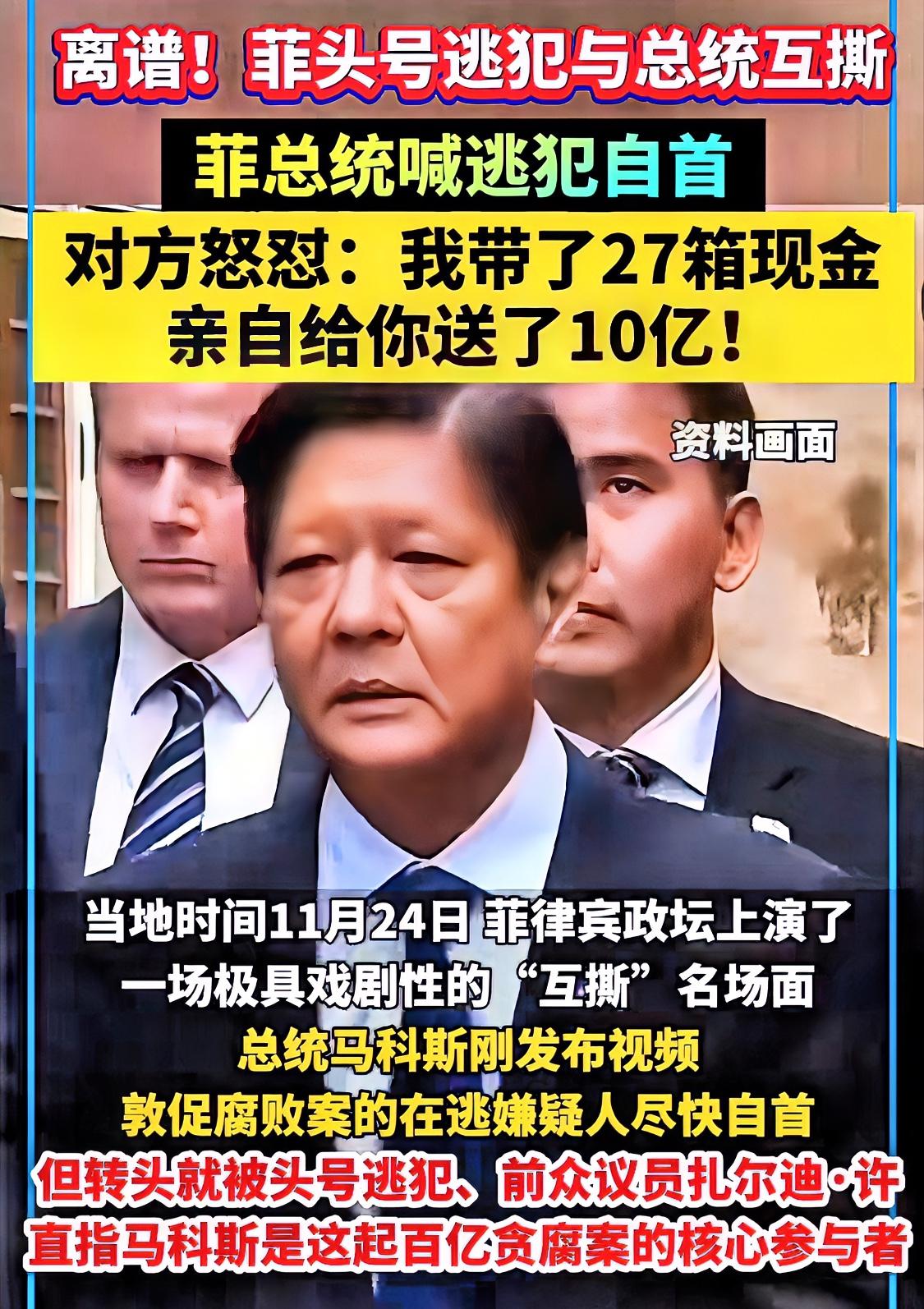 菲律宾总统这是反腐反到了自己头上了? 因一场洪水,菲律宾不少豆腐渣般防洪工程浮出水面,导致民怨沸腾。 菲律宾总统小马科斯在今年7月的国情咨文里公开披露,全国近一万项防洪工程存在严重异常。于是,近几个月来,数十万菲律宾民众走上街头要求彻查腐败案。 迫于舆论压力,小马科斯政府于本月中旬连发16条逮捕令。一周多过去,仍有11人在逃。于是,小马科斯在本月24日发视频劝这些已逃到海外的嫌犯们尽快回国自首。可谁成想,其中的头号逃犯,前众议员扎迪·许立马在网上发视频回击称,小马科斯本人就是这贪腐大案的核心参与者。其表示自己曾通过总统代表的司法部副部长分两次向小马科斯递送10亿比索现金,且公开了自己受贿详细的时间、地点和相关人物,并直接附了两张照片作为证据。一张是27个装满现金的行李箱,一张是列有付款明细和日期的单子。 这下,前有被亲姐指控患有毒瘾无力执政,后有原同僚拿出详细证据指控贪腐,小马科斯在菲律宾国内的声望算是要彻底崩了,其美爹想救他都无力。