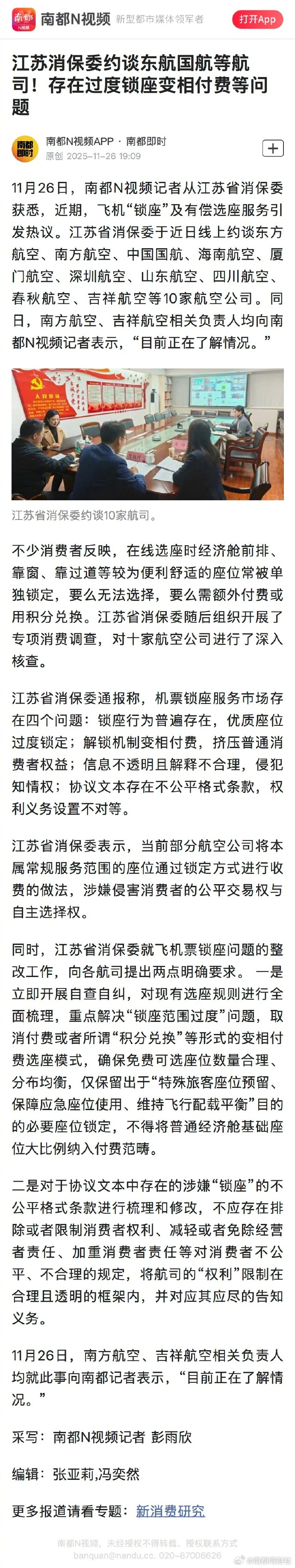 #江苏消保委约谈10家航司#【江苏消保委约谈东航国航等航司!存在过度锁座变相付费等问题】#多家航司被指过度锁座变相收费# 近期,飞机“锁座”及有偿选座服务引发热议。不少消费者反映,在线选座时经济舱前排、靠窗、靠过道等较为便利舒适的座位常被单独锁定,要么无法选择,要么需额外付费或用积分兑换。江苏省消保委随后组织开展了专项消费调查,并于近日线上约谈东方航空、南方航空、中国国航、海南航空、厦门航空、深圳航空、山东航空、四川航空、春秋航空、吉祥航空等10家航空公司。同日,南方航空、吉祥航空相关负责人均向南都N视频记者表示,“目前正在了解情况。”南都N视频记者 彭雨欣