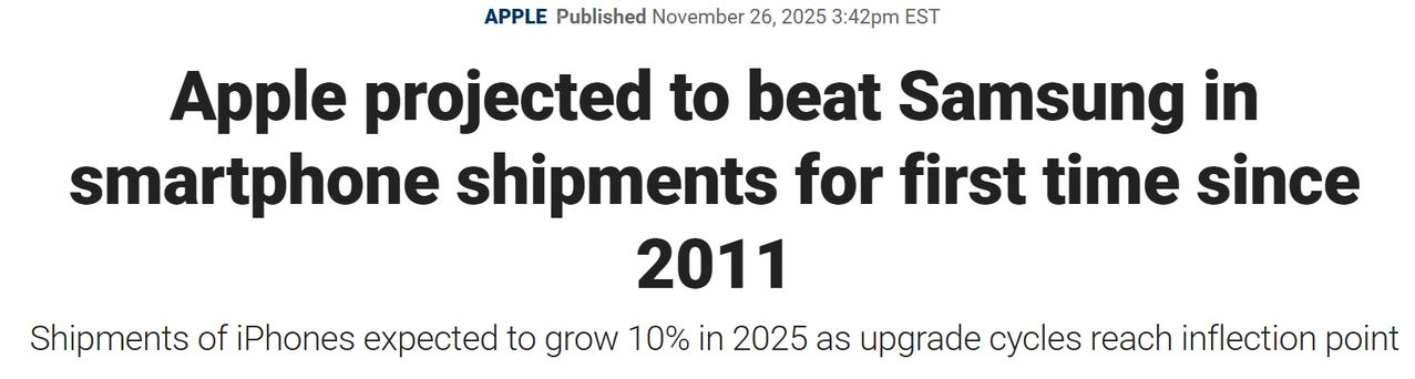 预计2025苹果手机出货量将自2011年以来首次超过三星 根据一份新报告,预计苹果2025年的智能手机出货量十几年来将首次超过三星,成为全球智能手机销售领先者。 Counterpoint Research的分析发现,2025年全球智能手机出货量将同比增长3.3%,其中很大一部分增长由苹果推动,Counterpoint预测,苹果2025年的出货量将达到全球占比的19.4%,而三星的出货量预计将同比增长4.6%,全球份额达到18.7%,这将使苹果自2011年以来首次成为全球领先的智能手机制造商。