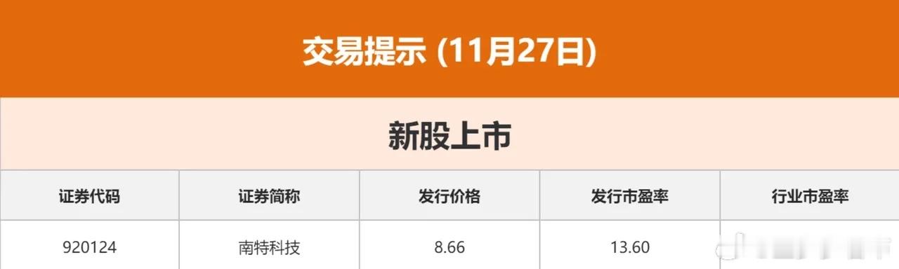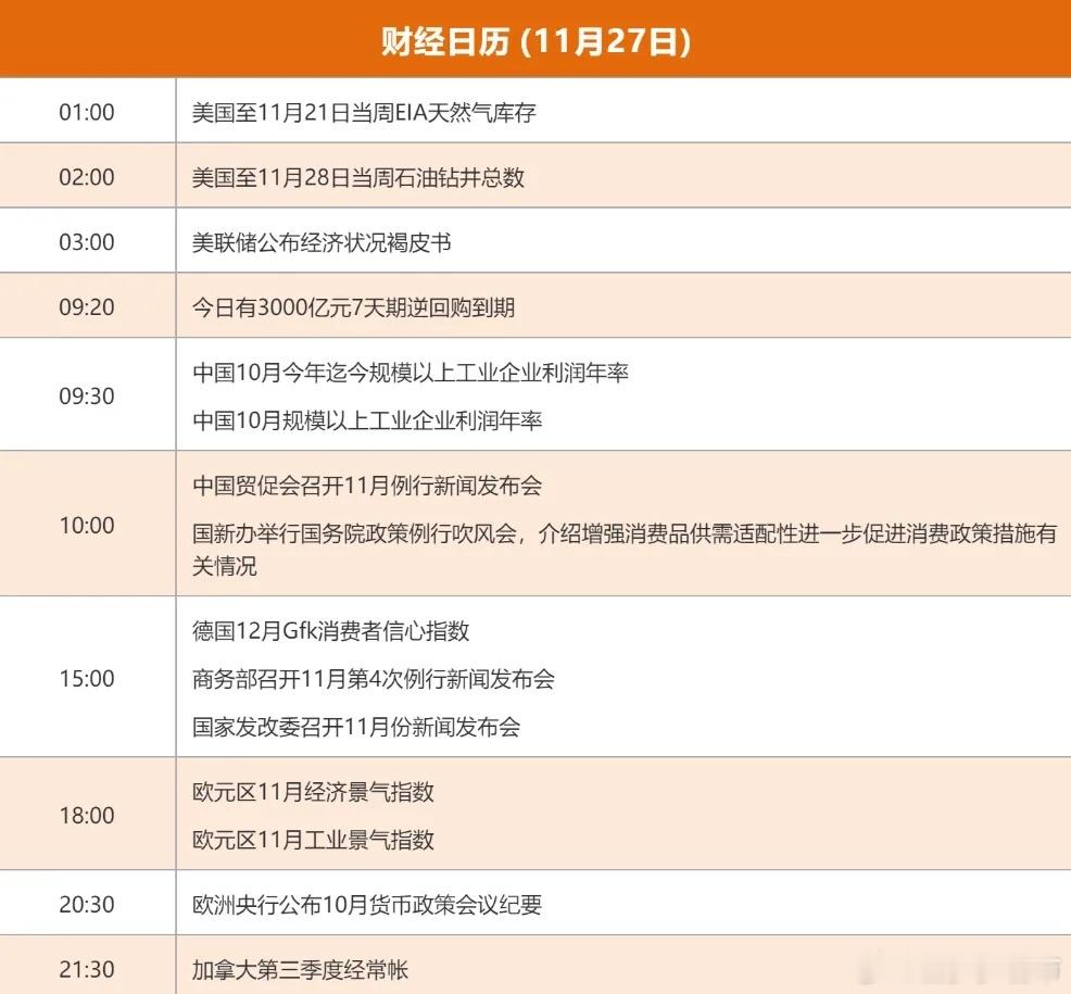 11.27股市早知道:1、外盘汇总:继续普涨,如图一。 2、交易提示:如图二。 3、财经日历:如图三。 4、三大指数:1)大盘:继续看涨2)创指:继续看涨3)科创50:继续看涨 5、重要新闻:1)发改委、工信部、央行等联合印发《关于增强消费品供需适配性进一步促进消费的实施方案》的通知;2)民政部:明年争取每省份推动建设1所示范性残疾人托养照护服务机构。 6、市场动态:1)高通推出第五代骁龙8移动平台;2)《疯狂动物城2》成影史进口动画片单日票房冠军;3)西部、国联民生、东北证券3券商公告获批综合账户试点;4)保险业协会:监管未批准或备案任何名称为“安我股保”的保险产品;5)北京启动专项行动重点整治六类金融领域网络乱象。 7、公司公告:1)龙净环保:公司当前储能电芯订单饱满,排产期已至明年6月;2)士兰微:公司已推出AI算力电源上的四颗关键模拟芯片;3)百傲化学:股东合计转让公司总股本的10%给刘红军;4)南方精工:股东拟合计减持不超过2.54%公司股份;5)一博科技:股东领誉基石拟减持不超2.98%股份;6)和胜股份:股东计划合计减持不超3%公司股份;7)张江高科:控股股东10月31日至11月26日减持1169.19万股。(关注点赞+评论,陪你一起到牛市)今日A股优质财经分享