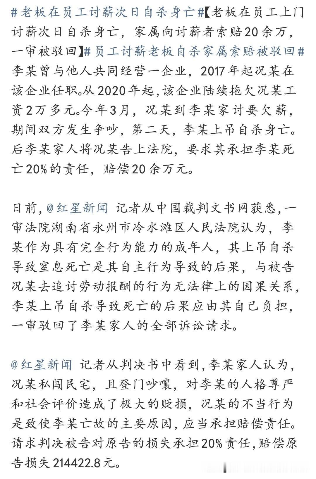 工人讨要血汗钱,老板第二天上吊了,家属转头把工人告上法庭索赔20万!法院一审驳回,判得明白:讨薪不背这锅! 这事儿听着离谱,细想却是当下职场生态的缩影。工人况某给李某干了八年活,被欠两万多元工资,上门讨要说理本是天经地义。谁能想到,老板一死,家属竟倒打一耙,说讨薪“贬损人格尊严”?要我说,拖欠工资本身才是对劳动者最大的尊严践踏! 某些企业主总把农民工当软柿子捏,以为欠薪能“拖字诀”过关。可法律不是摆设!《拒不支付劳动报酬罪》白纸黑字写着,恶意欠薪最高能判三年。这案子里,李某经营不善长期拖欠工资,本身已涉嫌违法。工人依法讨薪反而被讹,岂不是逼人走极端? 更讽刺的是,家属声称况某“私闯民宅”“吵嚷贬损”,却绝口不提李某脑梗术后抑郁、早有自杀倾向的病历。法院查得清楚:讨薪当天民警已调解平息,李某自杀纯属自主行为。 说到底,根治欠薪不能总等悲剧发生。政府得学学黑龙江道外区的“薪事码上办”,扫码立案、21天解纷;检察机关也该主动介入,支持起诉、监督立案,让工人维权不再靠“以死相逼”。老板们更该明白:欠债还钱是天道,逼急了的打工人,法律终会给他们撑腰! 职场不是江湖,讲的是契约精神。老板若真把员工当兄弟,岂会欠薪两年?家属若真讲情理,又怎会反咬讨薪人?法院这判决定分晓、正风气,咱得鼓掌!