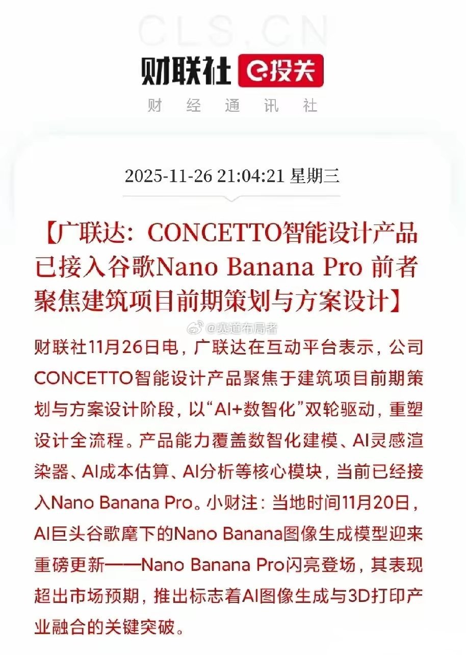 AI+建筑设计迎革命性突破!广联达联手谷歌,全产业链受益标的梳理建筑行业数字化转型迎来关键里程碑!广联达在互动平台披露重大合作进展:公司核心智能设计产品CONCETTO已正式接入谷歌Nano Banana Pro,两大行业龙头的强强联合,标志着建筑设计行业全面迈入AI赋能的新时代,技术革新与产业链升级机遇同步显现。三大核心利好引爆行业想象空间1. 技术颠覆传统设计模式:CONCETTO作为广联达旗下轻量化方案设计软件,原本已具备日照、采光、视野、风环境及人流分析等核心功能。接入谷歌Nano Banana Pro后,其AI渲染能力实现质的飞跃,不仅能生成更逼真的建筑效果图,更能大幅提升设计效率与成果质量,彻底改变传统建筑设计流程繁琐、耗时久的痛点。2. 精准契合数字化转型需求:在产业数字化浪潮下,建筑行业对智能化设计工具的需求日益迫切。广联达作为建筑数字化领域的领军企业,依托平台生态战略持续拓展业务边界,此次技术升级进一步巩固了其行业领先地位,有望持续抢占智能化设计市场份额。3. 全产业链协同受益:AI与建筑设计的深度融合,将引发从设计软件、3D打印设备到建筑材料的全链条升级。尤其在3D打印领域,谷歌Nano Banana Pro支持将2D图像直接转化为3D打印模型,与建筑设计场景结合后,将大幅降低建筑原型制作成本、缩短施工周期,释放巨大产业潜力。四大受益方向核心标的(不构成投资建议)- 建筑设计软件赛道:广联达(合作核心方,建筑数字化龙头,直接受益于技术升级与市场份额提升)、中望软件(国产工业设计软件标杆,有望依托行业智能化趋势加速渗透)。- 3D打印设备赛道:华工科技(3D打印技术领先,产品适配建筑行业个性化施工需求)、大族激光(激光3D打印龙头企业,技术积累深厚,可承接建筑领域增量订单)。- 建筑材料赛道:海螺水泥(建材行业龙头,智能化施工与绿色建筑趋势下需求稳定)、北新建材(新型节能环保建材供应商,契合建筑数字化升级的绿色发展导向)。- 建筑信息化赛道:赛意信息(工业互联网与数字化解决方案提供商,可赋能建筑企业全流程信息化改造)、汉得信息(企业数字化转型服务商,有望承接建筑行业智能化升级项目)。此次广联达与谷歌的合作,不仅将重塑建筑设计行业竞争格局,更将激活整个建筑科技产业链的投资热情。在AI技术加速落地的背景下,建筑产业数字化革命已进入实质性落地阶段,相关受益标的有望持续迎来资金关注。