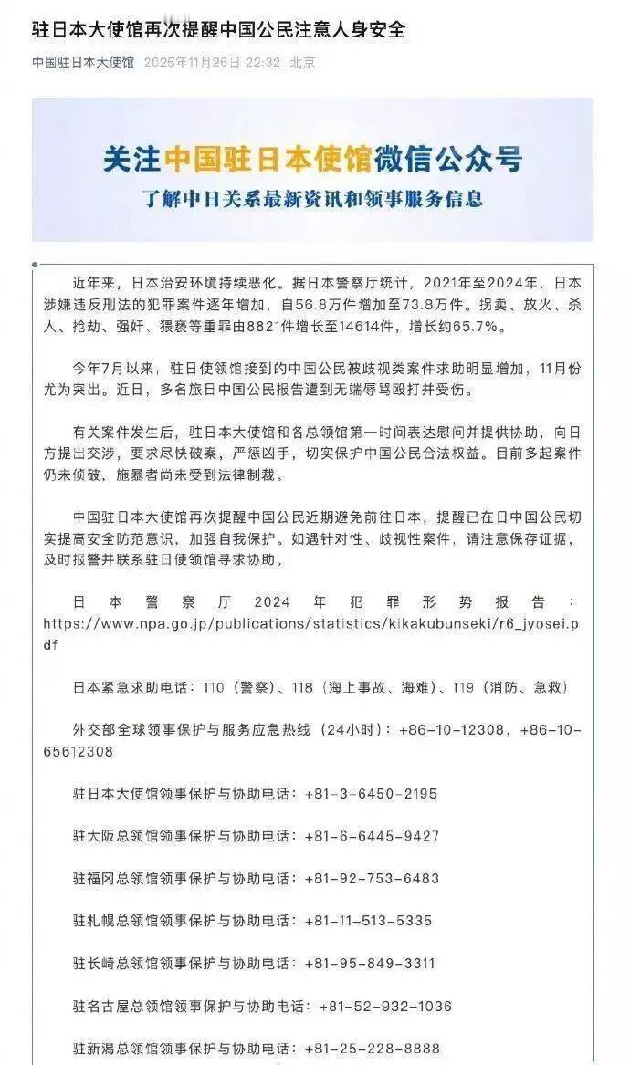 据中国驻日本大使馆11月26日发布的权威数据显示,近年来日本社会治安呈现明显恶化趋势,各类刑事犯罪案件犹如脱缰野马般持续攀升。日本警察厅最新统计报告揭示,2021年至2024年间,涉嫌违反刑法的犯罪案件数量呈阶梯式增长,从56.8万件激增至73.8万件,增幅高达30%。更令人忧心的是,拐卖人口、纵火、凶杀、抢劫、性侵等恶性犯罪案件数量犹如决堤之水,从8821件飙升至14614件,增长率逼近65.7%,这一数字犹如一记警钟,敲响了日本社会治安的警讯。 值得注意的是,今年下半年以来,针对中国公民的歧视性事件呈井喷式增长。自7月起,中国驻日使领馆接获的歧视类求助案件数量节节攀升,至11月更出现爆发性增长。近期连续发生多起恶性事件,多名旅日中国公民在公共场所遭遇无端辱骂、暴力袭击,部分受害者伤势严重,这些事件犹如一把尖刀,刺痛着在日同胞的安全神经。 面对这一严峻形势,中国驻日本大使馆及各地总领馆迅速启动应急机制,犹如坚固的盾牌般为中国公民提供全方位保护。在每起案件发生后,外交人员第一时间赶赴现场,像亲人般慰问受害者,提供法律咨询、医疗协助等全方位支持。同时,中国外交机构以最强音向日本政府提出严正交涉,要求日方以雷霆手段侦破案件,将犯罪分子绳之以法,切实构筑起保护中国公民合法权益的铜墙铁壁。然而令人遗憾的是,截至目前仍有大量案件悬而未决,施暴者依旧逍遥法外,这种状况犹如一团阴云,笼罩在旅日中国公民心头。