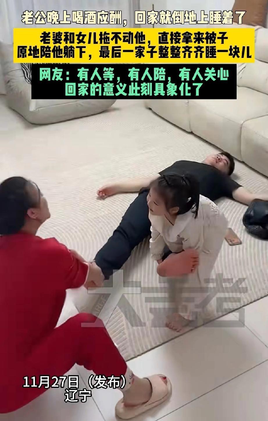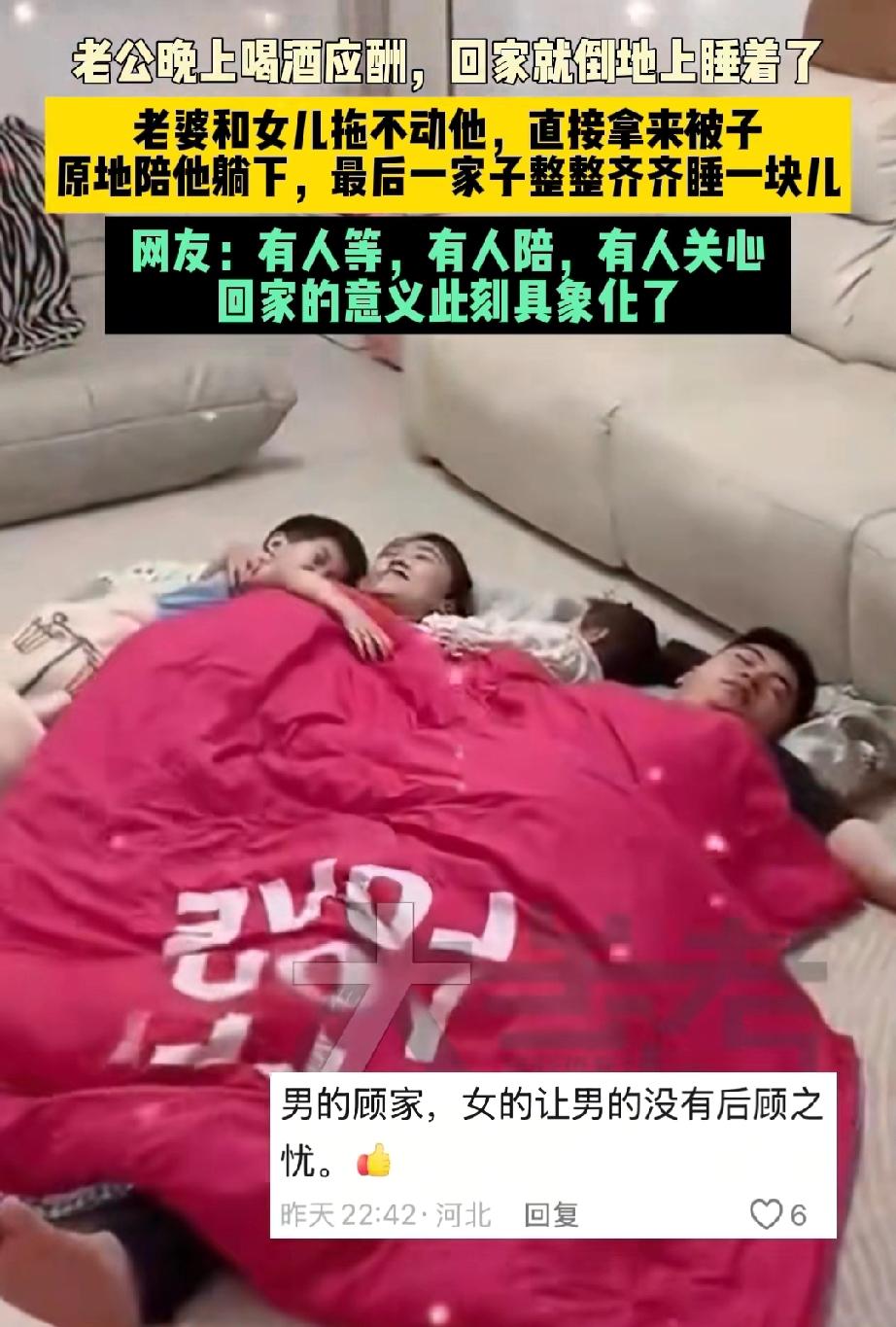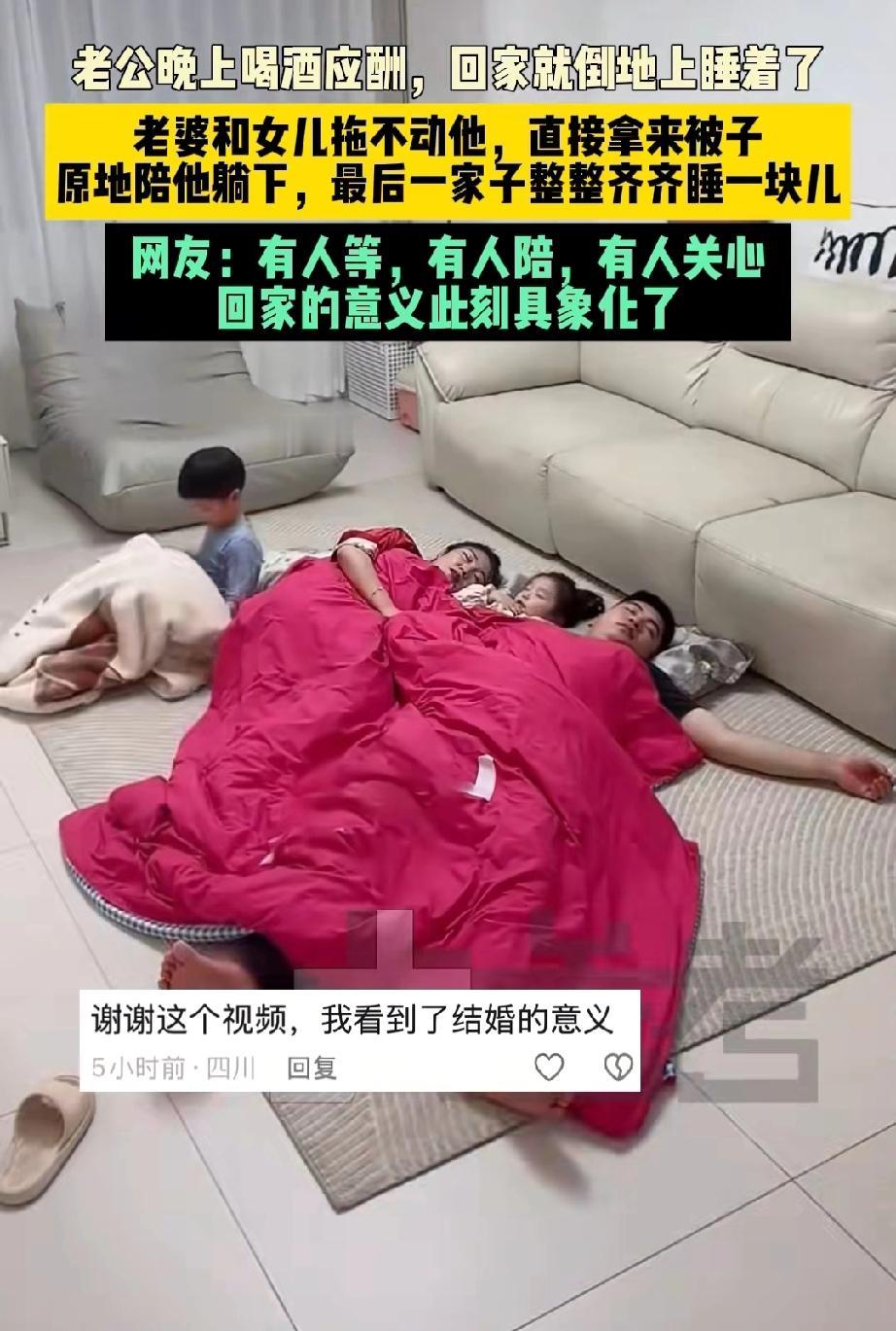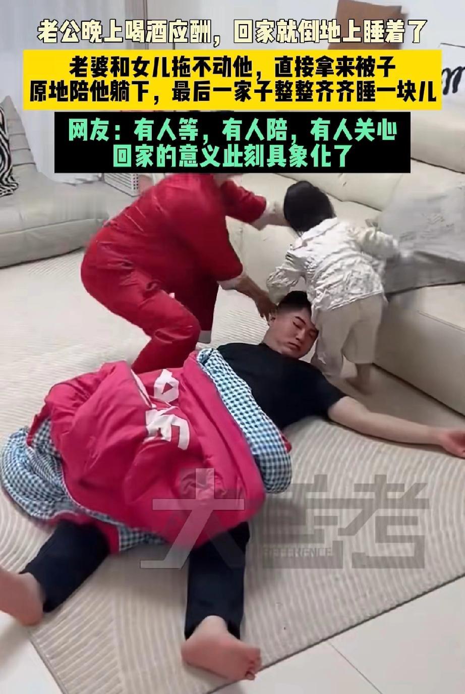 辽宁,一名男子醉酒归家后,径直倒在地毯上沉沉睡去。妻子和女儿试图将他拉回卧室,奈何力气有限,难以如愿。 女儿贴心地拿来枕头,轻轻垫在男子头下,妻子也赶忙取来被子,为他盖上。 随后,女儿挨着爸爸躺了下来,妻子见状也贴在女儿旁边躺下。 未曾想,早已入睡的儿子竟迷迷糊糊抱着被子走出卧室,依偎在妈妈身旁,紧紧地抱住了她。 一次醉酒,一家人在一张地毯上相拥而眠,这幅场景令人心生艳羡,尽显家人间相依相伴的美好。 此情此景,足以证明男子是一位称职的好丈夫、温柔的好父亲,是妻儿深爱、依赖与信任之人。 被爱是幸福的。想来清晨男子醒来,看到妻儿相伴身旁,共度一夜,心中定会满溢甜蜜。 这就是结婚的意义,当你需要照顾的时候,有伴侣,有孩子在。 人生何求?求的就是家庭和谐,简单又温馨的幸福! 来源:大参考