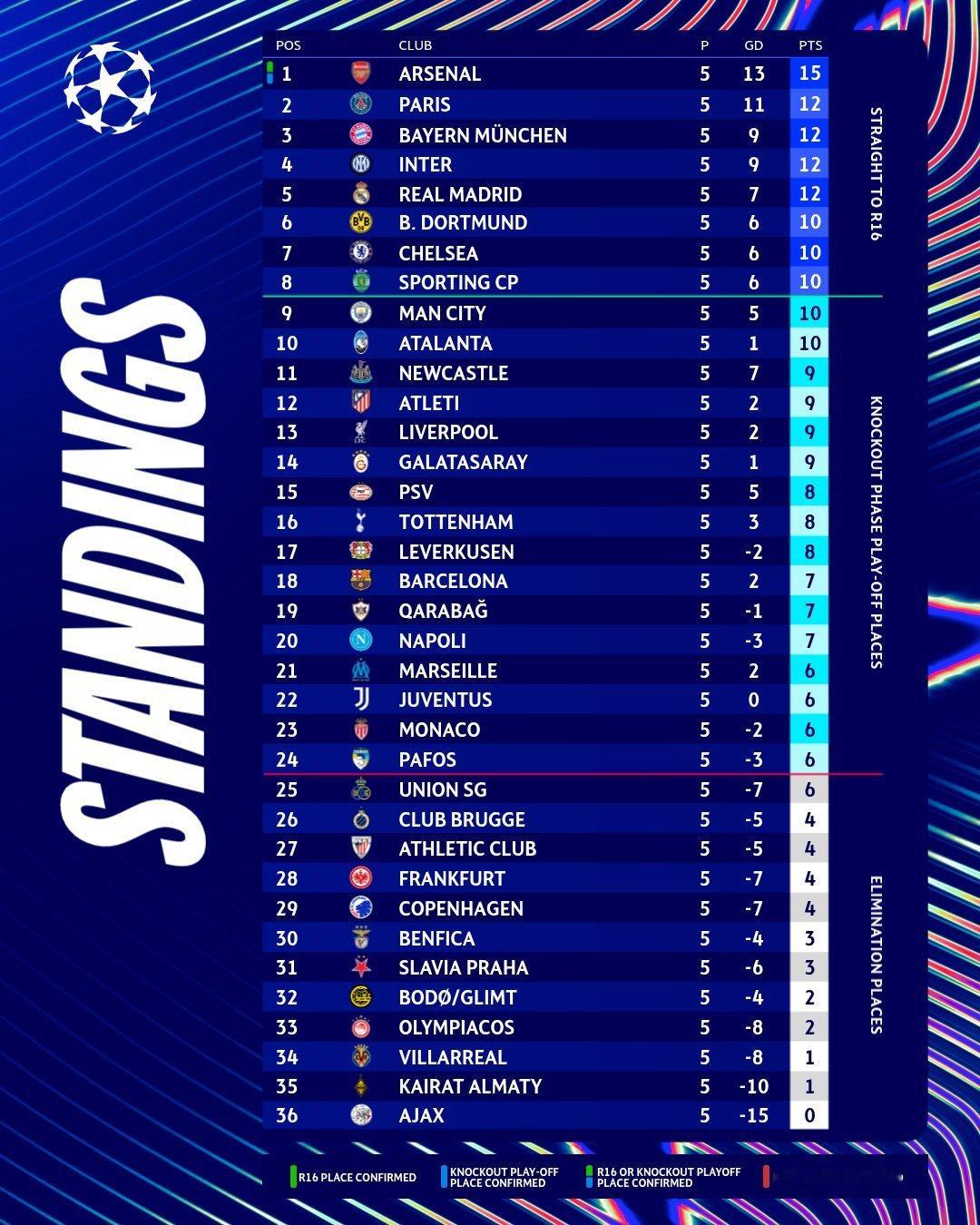 【欧冠排名】拜仁还在三强!有意思的是,前五名正好是五大联赛各一个代表:英超:阿森