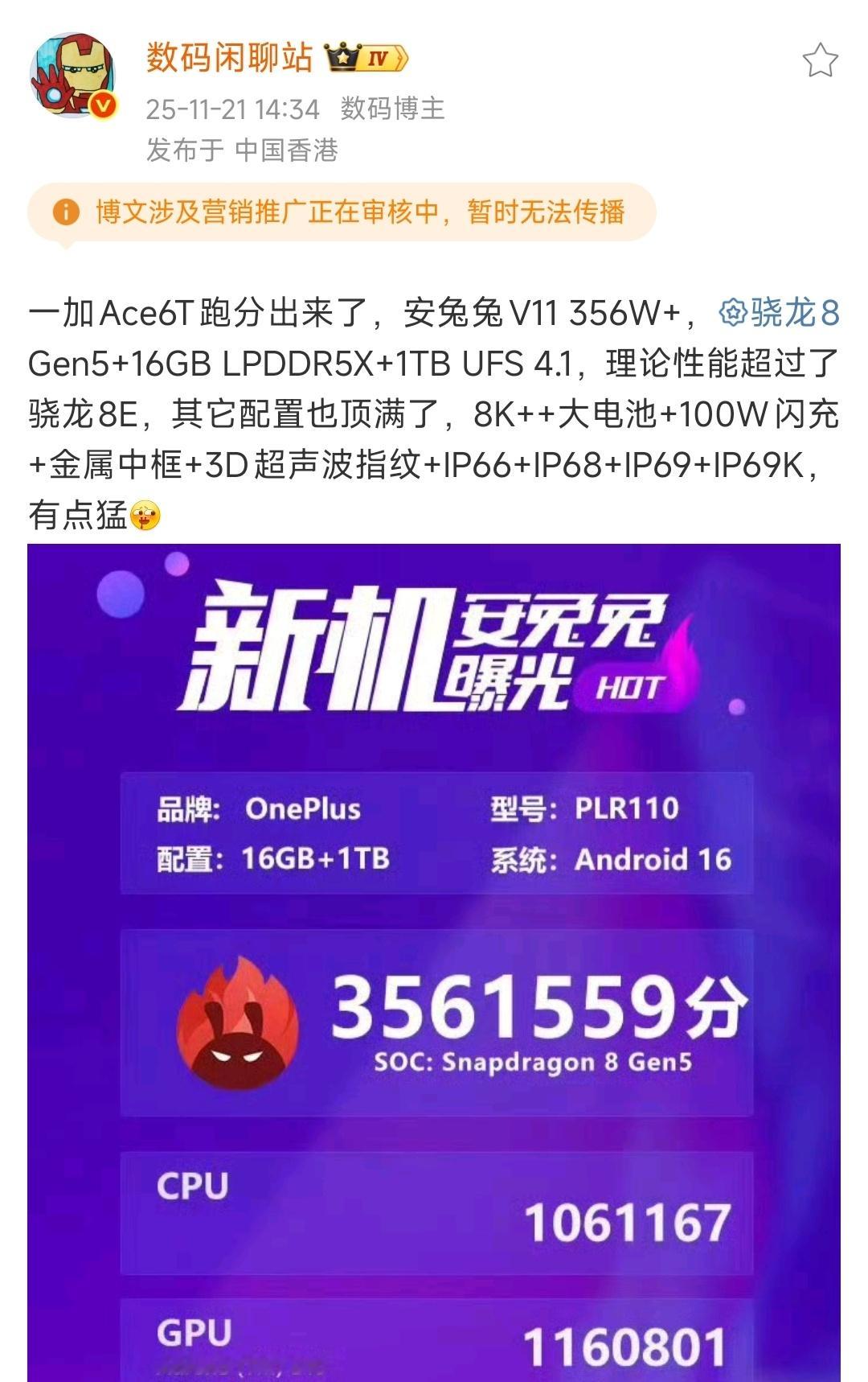 数码闲聊站 一加Ace 6T官宣定档!12月3日19:00!全球首发第五代高通骁龙8,1.5K 165Hz刷新率,金属中框+3D超声波指纹,IP66/68/69/69K,8000++大电池加百瓦快充,确实挺能打!