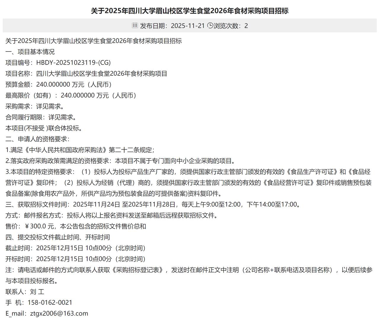 四川大学眉山校区启动240万元食材采购招标