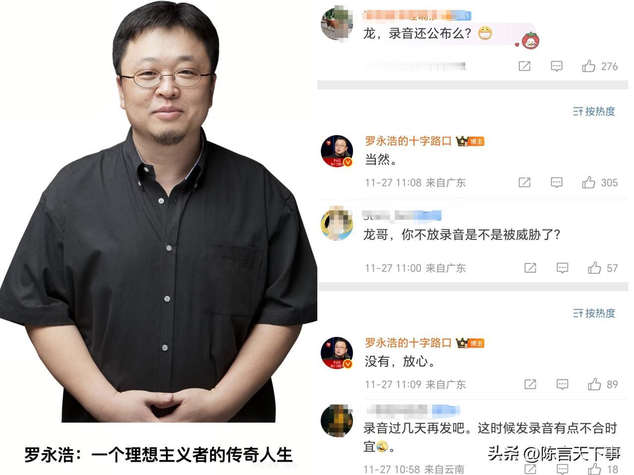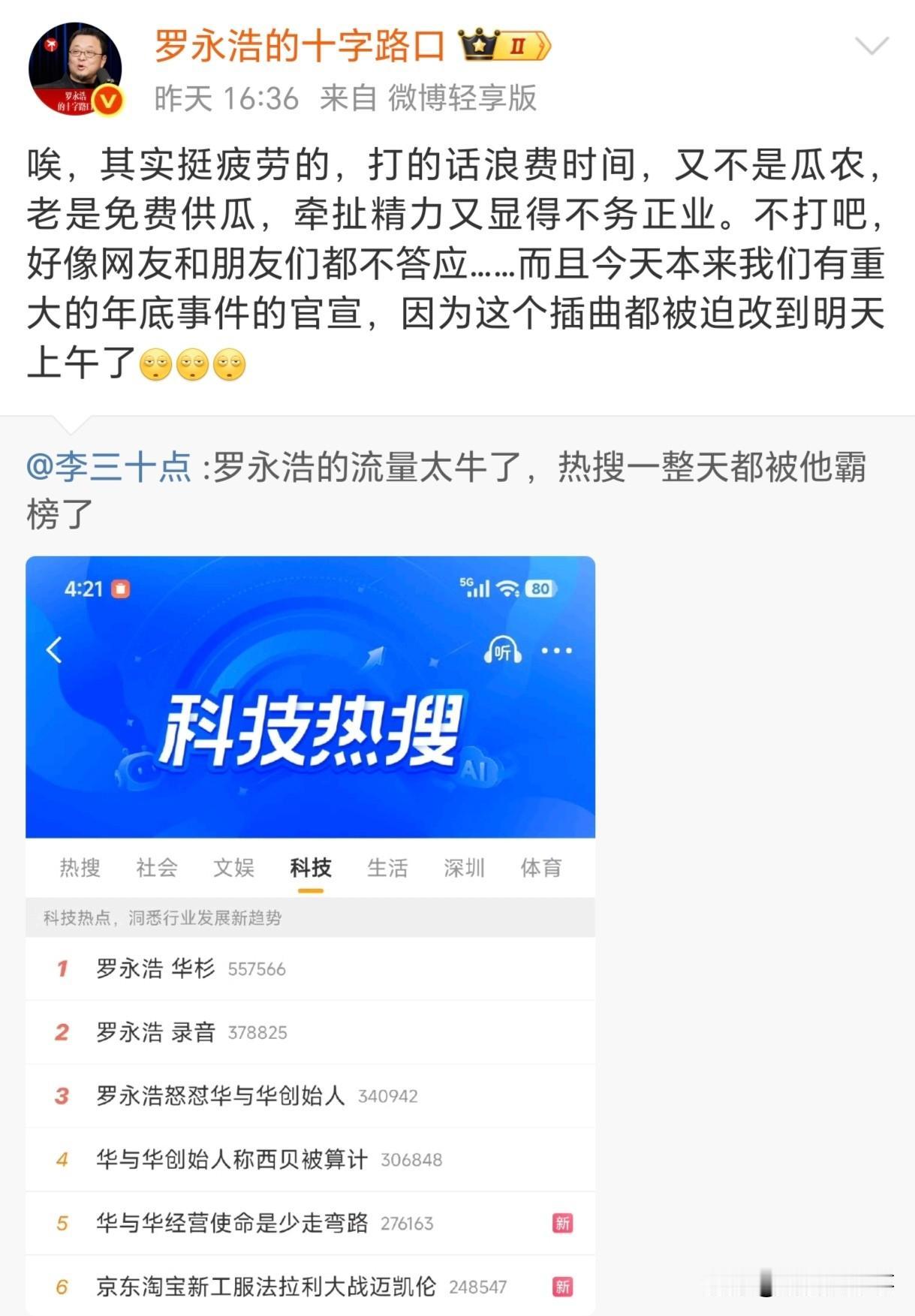 估计今天上午很多人都在等老罗爆料,结果等来等去,就等到一条消息! 老罗还没有把华衫的录音爆出来是啥,而是关怀了民生事件,对比而言,这确实要比录音重要,先关注民生,再处理私人恩怨。 而且~你仔细一看,老罗只是说会在“明天”上午官宣年底重大事件,并没有说明就是与华衫有关,都是热搜把老罗给逼急的,无缘无故就把他推上去了。 现在老罗也是骑虎难下,进退两难了,这个瓜,你说他要是继续打下去又浪费时间和精力,毕竟他又不是瓜农,老是免费供瓜;但他要是不打嘛,话都说出去了,网友都在期待下文,肯定不会答应的。 所以老罗给网友的答复,录音还是会照常公布的,就看是什么时候了。