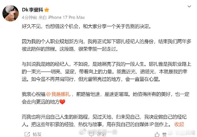 李登科卸任娜扎经纪人27日,娜扎经纪人