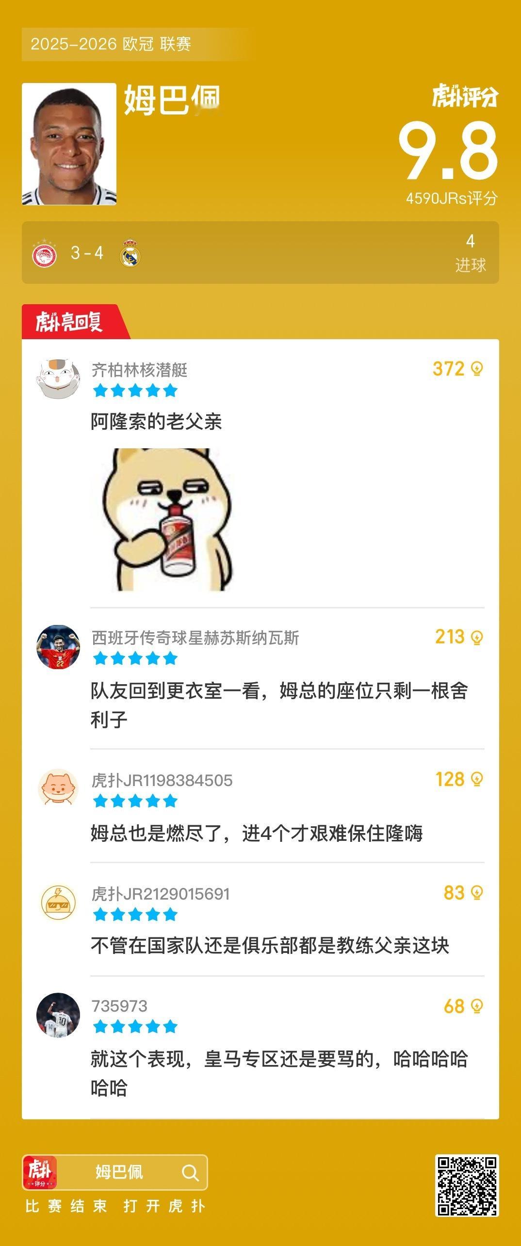 大四喜+当选MVP,姆巴佩赛后带走比赛用球并留下合影欧冠联赛阶段,皇马客场4-3击败奥林匹亚科斯,姆巴佩在比赛中上演大四喜。赛后,他带走了比赛用球和本场比赛的最佳球员奖杯。皇马官方也晒出了他与这两样道具的合影:“不出所料”。姆巴佩独中四元奥林匹亚科斯3比4皇马