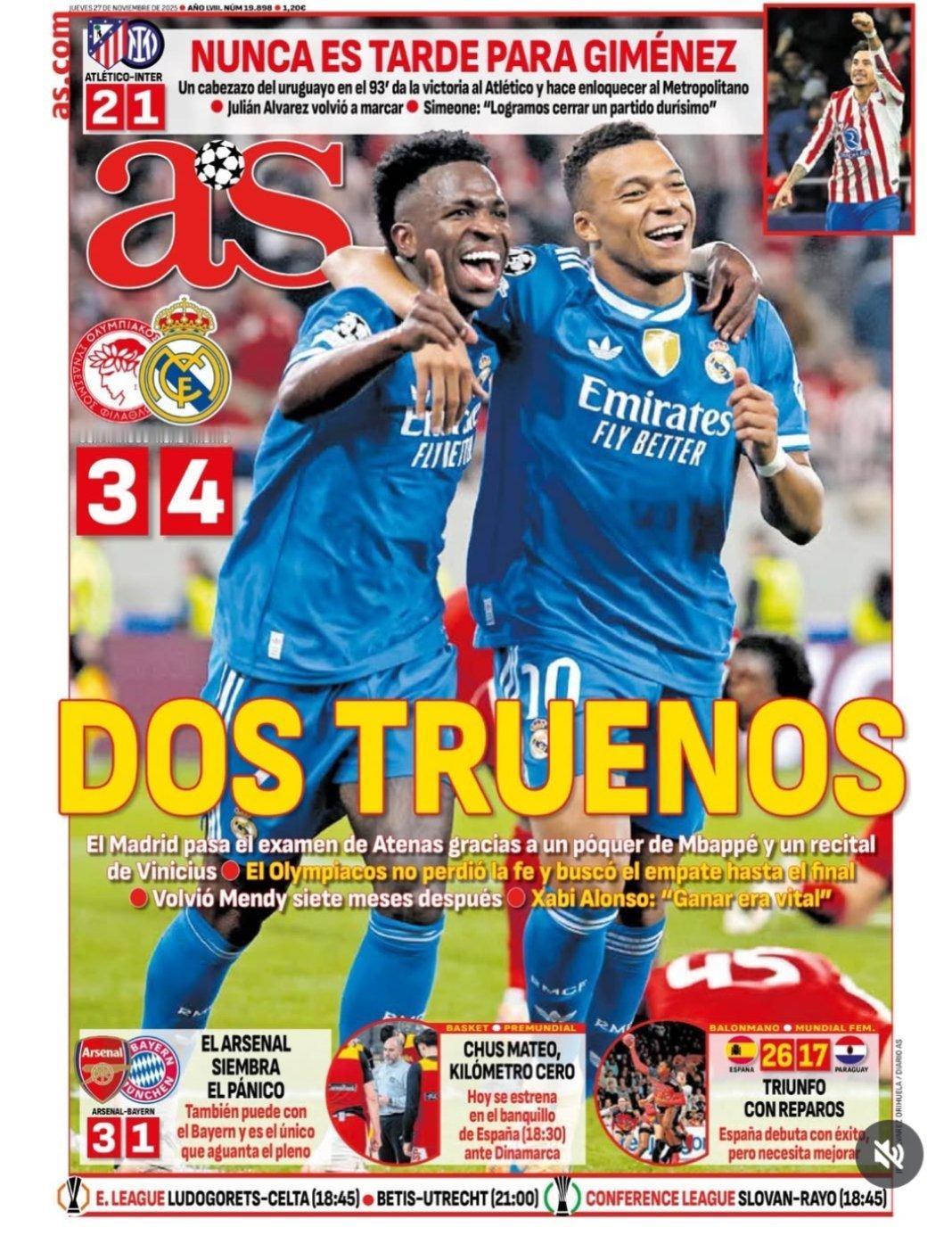 皇马 《阿斯》两朵霹雳多亏了姆巴佩的大四喜和维尼修斯的精彩表现,皇马过了雅典这道关奥林匹亚科斯一直没放弃信念,最后一刻仍在努力扳平门迪在伤缺七个月后回归阿隆索:“获胜是最主要的”