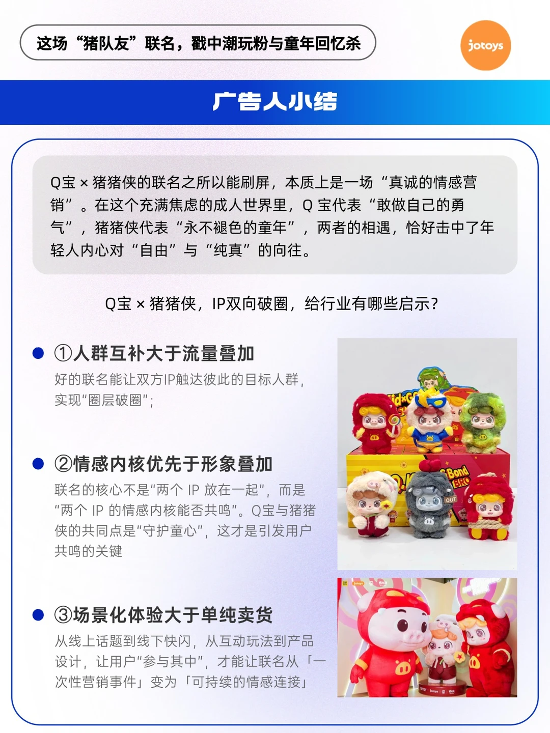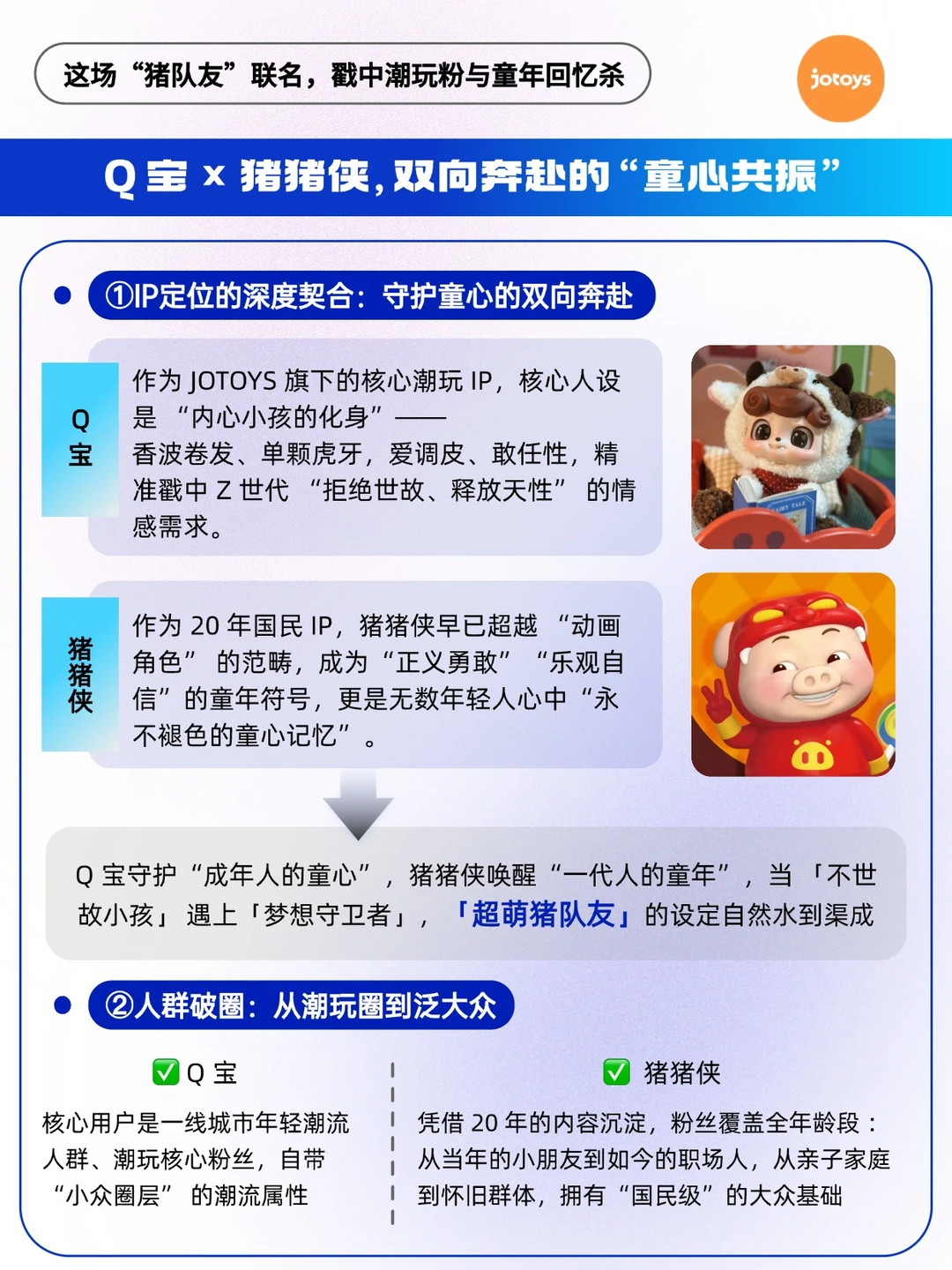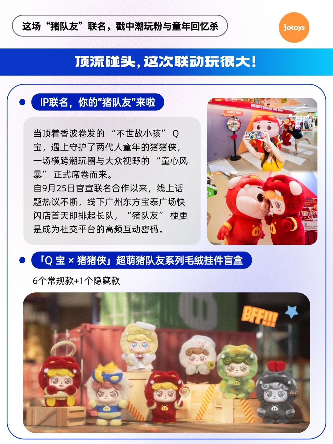 - 当顶着一头香波卷发、自带“小脾气”的潮玩IP Q宝,与守护了两代人童年的国民英雄猪猪侠牵手成功,一场跨越圈层的“童心风暴”便已注定[得意R] 🔥官宣即引爆,线上一片热议,线下快闪店排起长龙——“猪队友”这个梗,在九月末成功超越了它原本的语义,成为一种全新的社交货币。这不仅是两个可爱形象的简单同框,其背后,是一场基于深度情绪洞察与精准市场策略的“双向奔赴”。 🔵Q宝,作为Z世代“内心小孩”的化身,守护着成年人不想遗失的童真; 🔵猪猪侠,作为跨越20年的动画符号,则唤醒着集体记忆中的勇气与梦想。 它们的联名,是 “情绪价值”与“国民记忆”的一次共振,精准击中了当下年轻人对“纯真”与“陪伴”的广泛渴望。 *图片素材来源于网络