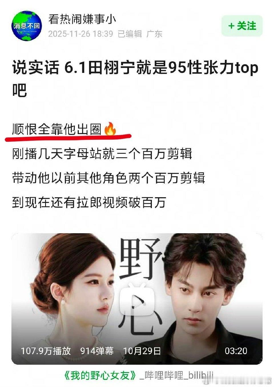 原帖行文很明显是想引人来嘲田栩宁的,没想到评论区大家都觉得没问题,甚至贡献了从数据维度到演技细节维度的佐证