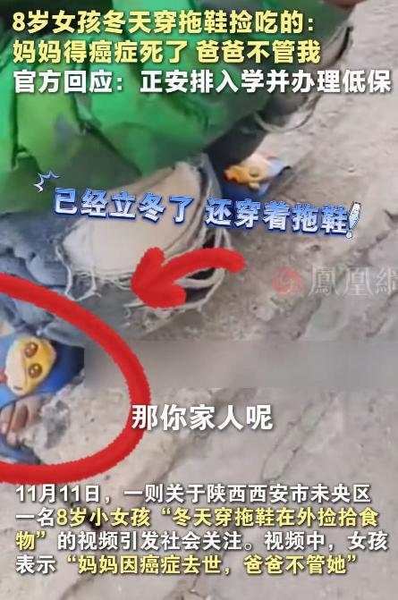 看的人眼泪直流!陕西西安,8 岁女孩冬天只穿一双拖鞋,在路上捡吃的!一位女子看到后,问她妈妈呢?没想到女孩说:“妈妈得癌症死了,爸爸不管我……”网友:真是没妈的孩子是根草啊!她妈妈在天上肯定急得团团转! 冰冷的清晨,城南小巷的路边,一个身影突然闯进行人们的视线——一个大约八九岁的小女孩,瘦得像风一吹就会倒,身上穿着一件旧棉袄,鞋却只有一双被磨破的蓝色塑料拖鞋。 她的脚趾冻得通红,甚至裂开了口子,沾着干涸的血。更让人揪心的是,她正翻着路边的垃圾桶,像是在寻找什么。 一位路过的女子下意识停下了脚步。 女孩从垃圾桶里小心地捡出一块吃剩的烧饼,轻轻拍掉灰,再小口地咬着。她的动作慢极了,像是怕打扰了谁,又像是怕这块饼突然在她手里消失。 女子心脏像被针扎了一下,忍不住走过去蹲下:“孩子,你怎么穿这么点?你家大人呢?” 女孩被吓了一跳,手里的烧饼差点掉落。她抬起头,黑黑的眼睛里没有同龄孩子的灵动,只有过早积累的谨慎与麻木。 她小声回答:“妈妈去世了……得了癌症,去年冬天走的。” 女子心里猛地一颤:“那……爸爸呢?” 女孩的眼睫毛因为寒冷而微微颤动,她努力咽了一下:“爸爸不管我。他每天在家窝着,不跟我们说话,也不出去打工。” 女孩说这些话时,语气平静得像是在讲别人的故事。 女子喉咙发紧:“那你们吃什么?谁照顾你?” “爷爷奶奶……” 她垂下头,“他们年纪大,走路都要拄着拐杖。妹妹才四岁,也要他们照顾。我就……就出来看看有没有能吃的。” 女子几乎不敢相信自己的耳朵,既心疼又震惊。她忍着心里的酸涩,轻声问:“你不上学吗?” 女孩犹豫了一下,摇头:“上过半年。后来……没有钱了,也没人给我做饭,我就……没去了。” 那一刻,女子感觉心被狠狠揪住。这个本该在课堂上背着小书包、写着字、做着梦的孩子,如今却站在寒风里,穿着拖鞋,从垃圾桶里找食物。 女子颤着手掏出手机,拍下这一幕,不是为了曝光谁,而是想让更多人看到,或许能帮帮这个孩子。视频发到网上后,迅速引起关注。很快,就有网友表示愿意实地去了解情况。 随着进一步走访,一个被生活压得透不过气的家庭图景逐渐被揭开——女孩的爸爸曾有过两段婚姻,第一任妻子离世时留下两个儿子,如今跟着姥姥生活。 第二任妻子,也就是女孩的亲生母亲,在生下最小的妹妹后不久患病去世。 短短几年,家里两次遭遇打击,父亲像是被谁抽去了灵魂,只剩下一具麻木的身体,每天呆坐在屋里,不说话、不干活,也不照顾孩子。 家里的担子就落在七十多岁的爷爷奶奶身上。两位老人身体早已不再硬朗,爷爷有严重的风湿,奶奶心脏不好,连自己都照顾不来。 每天,他们拄着拐杖艰难做饭,劝孩子吃点,又怕自己摔倒;夜里则担心屋子漏风,孩子冻坏。 邻居说:“老人已经尽力了,可这摊子太沉了,他们撑不动了。” 最让网友们揪心的,是女孩那句轻轻的陈述——“我妈妈死了,爸爸不管我。”话说得那么平静,但那平静背后,是沉甸甸的孤独,是小小年纪被迫承担的命运。 有网友留言:“真是没妈的孩子像根草啊……她妈妈在天上知道了一定急得落泪。” 网上逐渐有人组织募捐,有人联系当地救助部门,也有人愿意提供长期资助。越来越多的人希望这两个孩子不要被寒冬和贫困吞没。