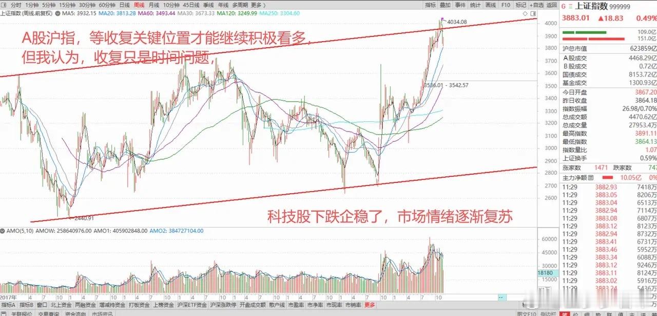 关税豁免大利好来临,A股各大指数全面上涨,科技股继续走强,静待反攻时刻! 1、美对华关税豁免大利好来了! 美东当地时间11月26日,美国贸易代表办公室宣布,原定于今年的11月29日到期的对华301关税调查豁免条款,现将豁免延长至2026年11月10日。适用商品的内容包括178项商品,这些产品出口美国时,可免缴因301调查而加征的7.5%-25%额外关税。 2、美股科技股继续反弹,纳指四连阳 昨夜美股科技股继续强势反攻,纳指上周四跌破了120日均线以后,目前已经实现4连阳,于昨夜收复了所有均线。昨夜美股道指上涨0.67%、纳指上涨0.82%、标普500指数上涨0.69%,半导体方面强势上涨,超威半导体上涨3.93%、博通上涨3.26%、英伟达上涨1.37%。 3、欧洲亚太股市全面上涨 由于美股科技股强势,昨夜欧洲股市全面飘红,今天亚太股市也表现优秀,日韩股市早盘跳空高开,盘中涨幅纷纷都超过了1.5%,可惜临近午间开始跳水回落,截止北京时间11:30分,日经225指数回落到1%附近,韩国股市涨幅回落到0.5%附近;港股横盘震荡微涨,表现较弱。 4、A股4大指数全线上涨 A股上证指数平开震荡走高,午间涨幅为0.49%,收在3883点,距离收复关键下行趋势,仅有一线之隔。截止午间收盘,深证成指、创业板指、科创50指数分别上涨0.38%、0.56%、0.98%,科技股表现强势。上午两市个股涨多跌少,共计3338只股票上涨,仅1884只股票下跌。 5、仍然在洗盘 从量能表现来看,实际上大盘仍然未到大反攻的时候,还在洗盘阶段。上午两市成交额仅1.09万亿,比昨天上午还要缩量466亿,如果下午没有异动,全天成交额也就在1.7万亿左右。说明现在市场还处于新一轮行情起来之前的缩量时期。 综上所述,行情虽然还未启动,但是已经出现了启动迹象,创业板和科创板开始逐渐结束下跌洗盘,开始企稳上涨。目前大盘还处于关键承压位置下方,但是在这个位置从8月底至今,洗盘已经超过3个月时间。快的话,春季行情将于12月开始,慢的话是1-3月,目前市场情绪上,看空的情绪并不高。泛财经知识节财经新势力财经